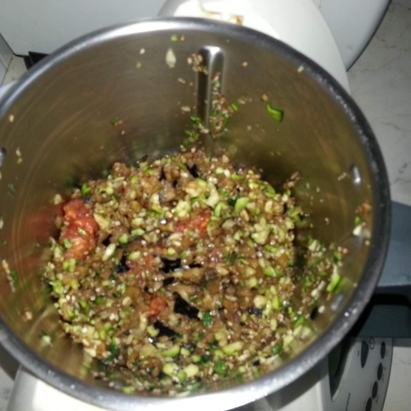 Frullare zucchina e malanzana 15 sec. vel.4, unire l'olio e la salsiccia sbriciolata e cuocere 5 minuti 90° vel.1 spatolando.