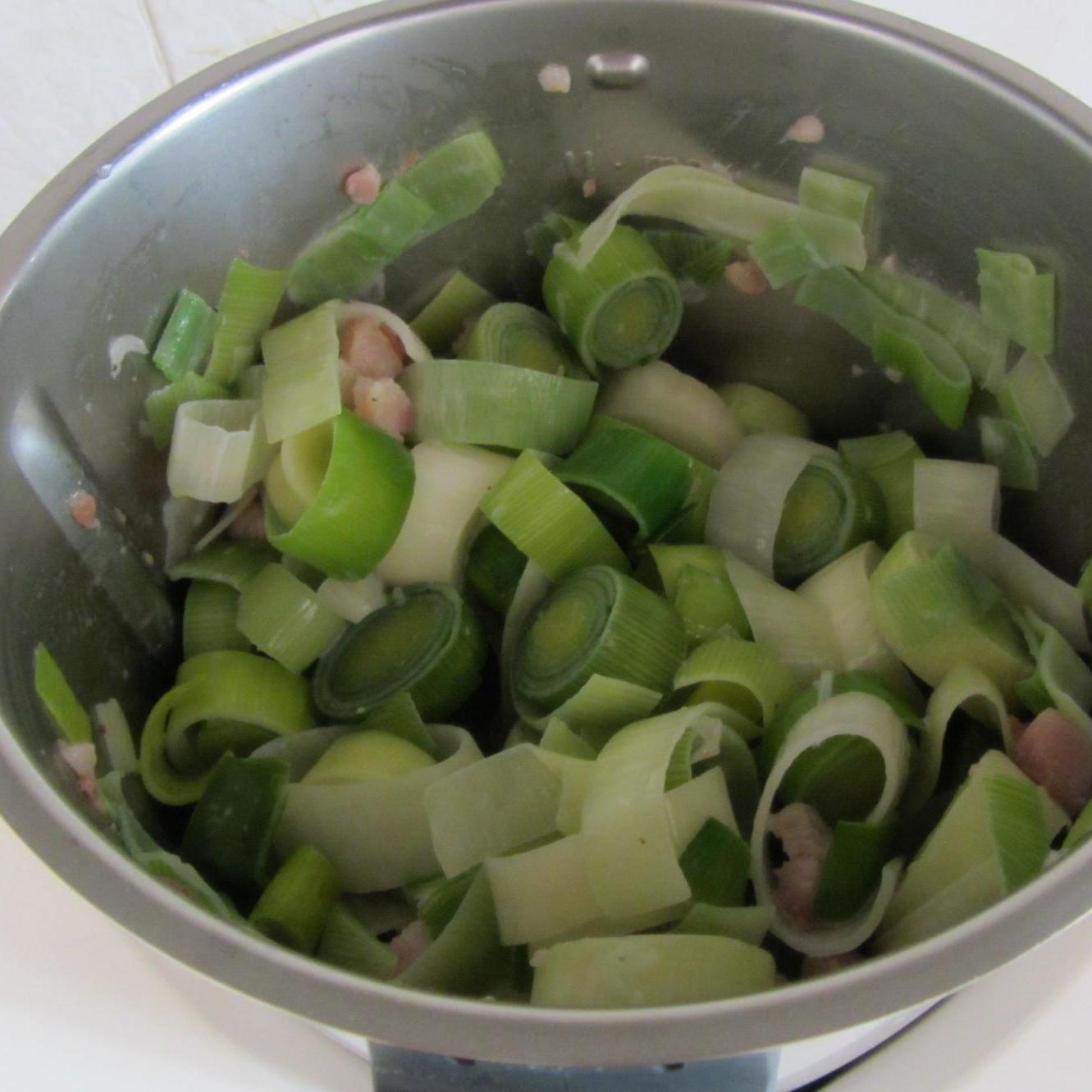 Mettere nel boccale l'olio, la pancetta e i porri, lasciare insaporire: