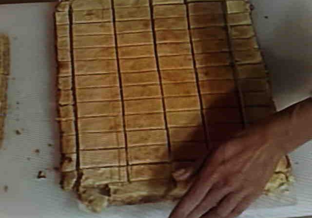 dopo la cottura si presenta così e noi dobbiamo lasciar raffreddare e poi tagliare a quadrotti rettangolari un pò regolari io ho preso la misura del coltello come se fosse stata una riga di geometra per andare dritta e ho porzionato i biscottini