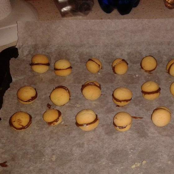 1. Inserire tutti gli ingredienti nel boccale,30 sec. Vel.5,togliere l impasto e farlo riposare in frigo,formare dei rotolini grossi un dito,tagliarli a pezzettini e formare delle piccole palline,disporre le palline in una teglia da forno ricoperta da carta da forno,cuocere nel forno preriscaldato a 170° x 15-20 minuti,non devono scurire troppo anche se rimangono morbidi,raffreddandosi rimangono fragranti,sciogliere il cioccolato fondente,spalmarlo sulla metà della pallina e attaccare i biscottini