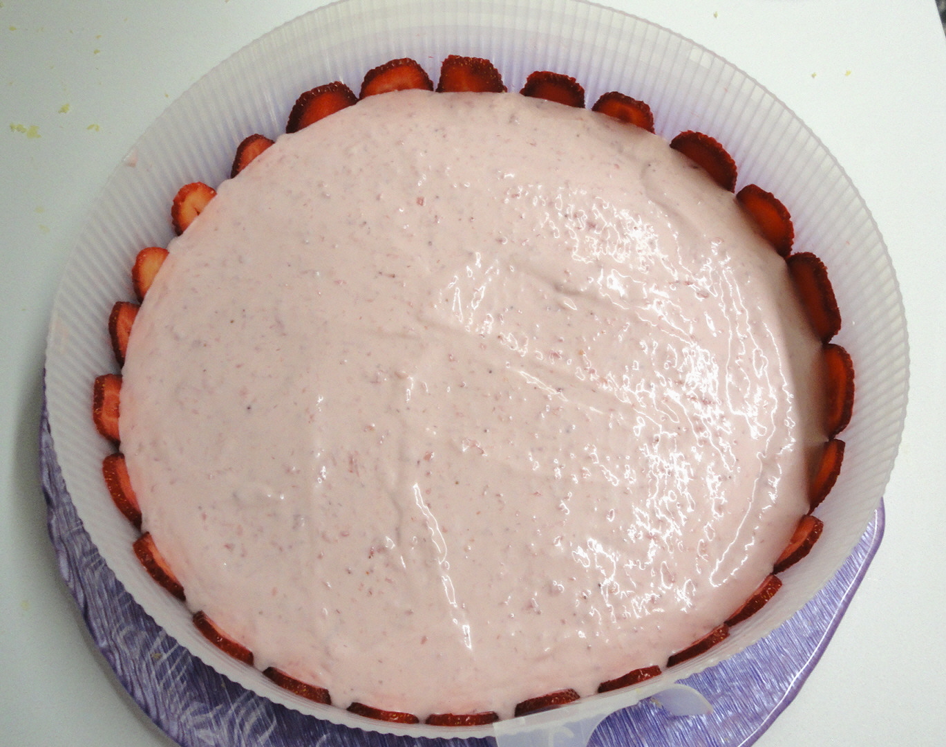 Mettere la gelatina a bagno in acqua fredda. Frullare le fragole 20 sec. vel. 3-4 e poi cuocere 7 min. 100° vel. 3. Aggiungere poi la gelatina strizzata e far sciogliere 5 sec. vel. 3. Aggiungere anche la crema e frullare altri 5 sec. vel 3-4. Far raffreddare un po' ed infine unire il composto di fragole alla crema di mascarpone. Lasciare che la crema si addensi un po' e nel frattempo prendere un anello per torte (diametro 30 cm), disporlo in un piatto, mettere il primo strato di pan di spagna e bagnare con acqua e zucchero. Ora ricavare dalle fragole delle fettine sottili, disporle intorno all'anello e fare uno strato con la crema di fragole. Mettere il secondo disco di pan di spagna, schiacciare un po' per far aderire bene, bagnare di nuovo e versare l'ultimo strato di bavarese. Far raffreddare in frigorifero per almeno un'ora.
