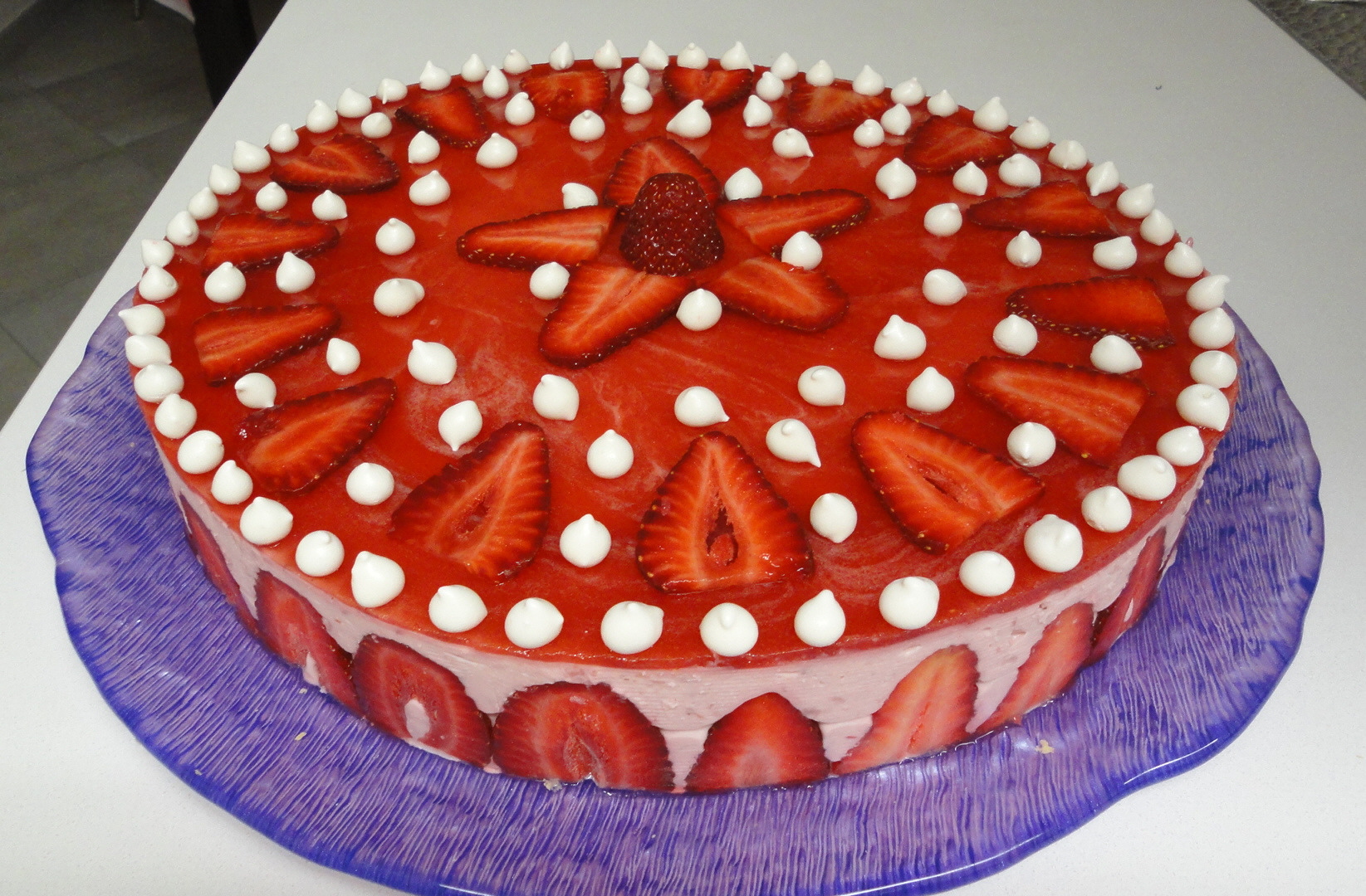 Fatto questo preambolo, devo dire che è venuta proprio buona, ho usato 1 kg di fragole. Mando la foto della torta...ho decorato con solo 1 fragola perché non ne avevo più!