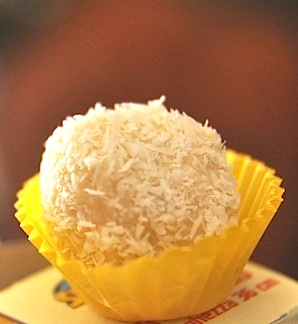 In un vassoio o in una terrina mettere la farina di cocco e iniziamo a preparare il cioccolatino, mettersi in una mano un po di composto, prendere una mandorla piccola e metterla al centro, chiudere e con le mani formare la pallina che faremo rotolare nella farina di cocco. Mettere direttamente nel pirottino. Quando tutti i cioccolatini saranno pronti conservare nel frigo.