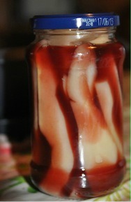"antiorario" , vel. 1. Controllate la cottura, devono essere morbide ma non stracotte. Mettere dentro dei vasetti sterilizzati abbastanza capienti e versare dentro il vino ancora caldo fino a coprire le pere e chiudere il barattolo e capovolgerlo per creare il sottovuoto. Lasciarle cosi' un'oretta e poi conservarle ( non in frigo, va bene lo sportello)E veniamo alla cena, ieri sera ho preso queste pere fatte qualche settimana fa, ho fatto velocemente un gelato alla fragola e ho accompagnato queste pere con una pallina di gelato, spolverando sopra un po' di cannella in polvere e zucchero a velo.