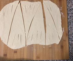 - Ricaviamo sei triangoli e facciamo una piccola incisione alla base di ognuno. Prepariamo 6 foglietti di carta forno, che serviranno per la cottura. Arrotoliamo i triangoli, diamo forma ai cornetti e mettiamoli sui fogli di carta forno. Copriamo i cornetti con un canovaccio e lasciamoli riposare per circa 20 min.