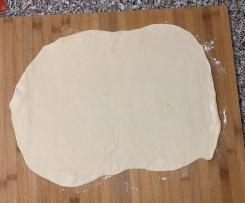 Mettere l'impasto in una ciotola capiente, incidiamolo a croce e copriamo con la pellicola trasparente. Lasciamo lievitare fino al raddoppio del volume, circa 90 minuti. - Trascorso il tempo di lievitazione, prendiamo il nostro impasto e con un mattarello stendiamolo sul piano di lavoro,fino ad ottenere una sfoglia rettangolare spessa circa mezzo centimetro.