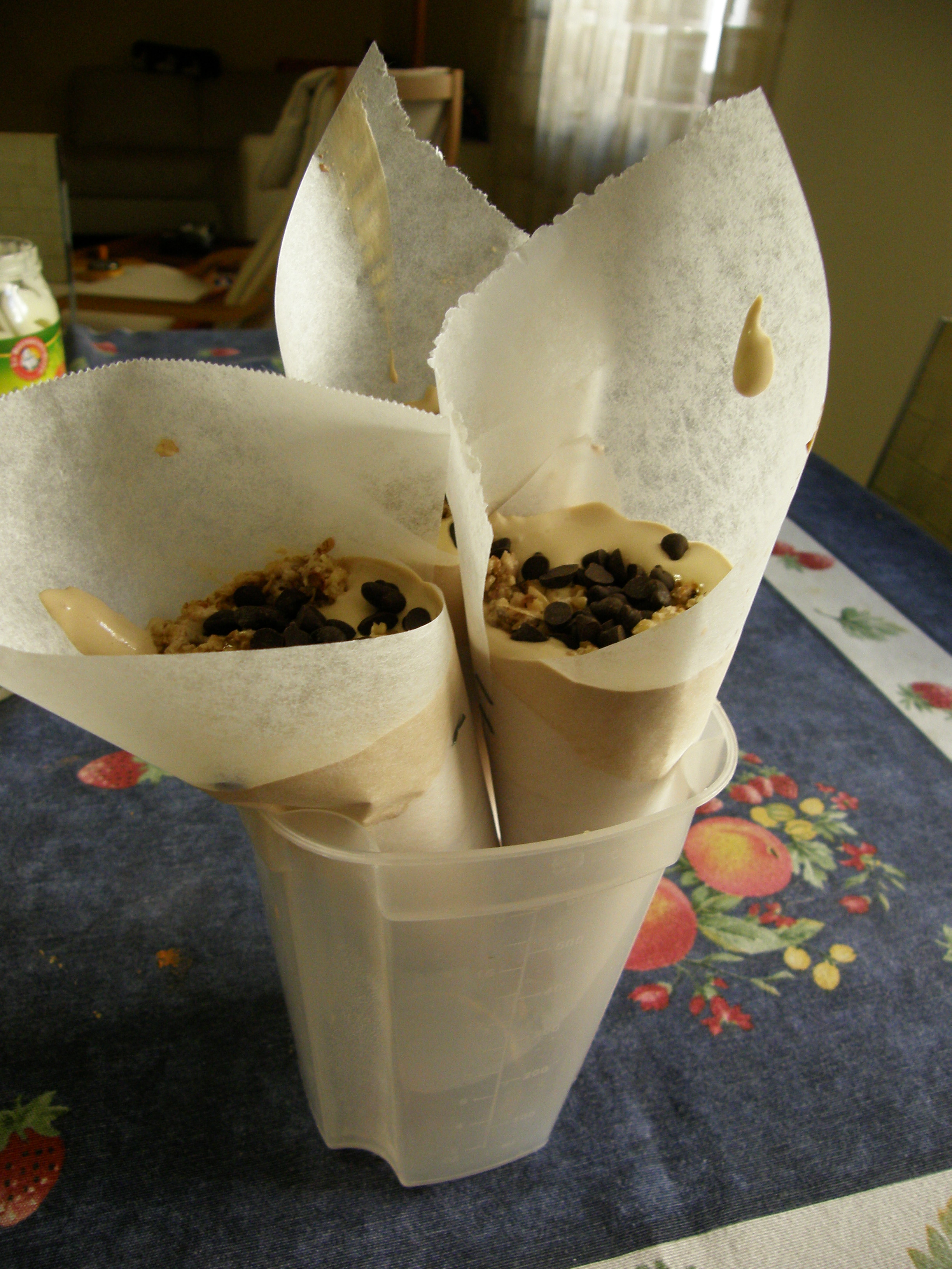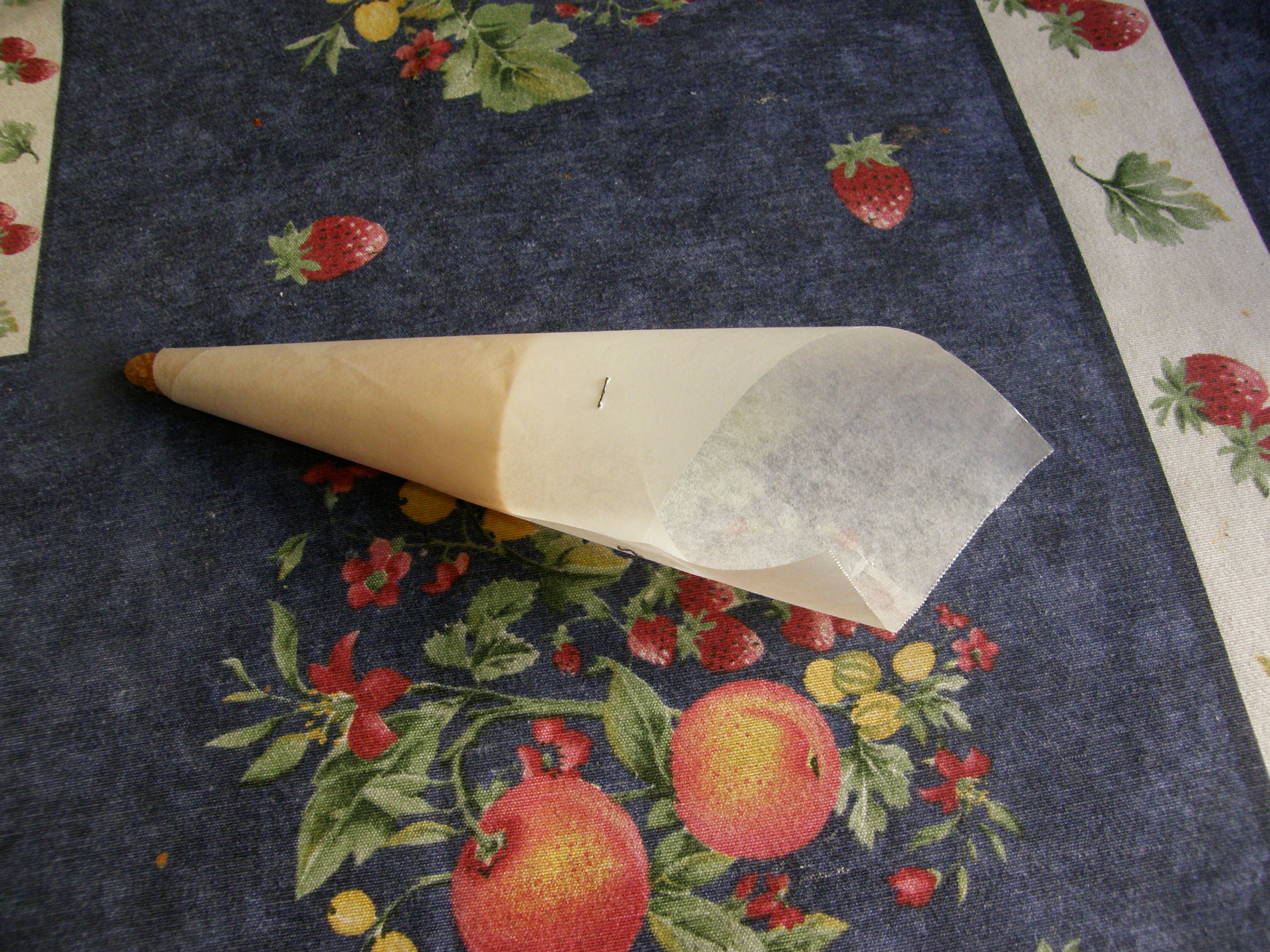 Preparare della stisce di carta forno con cui rivestire i coni facendo in modo che la carta sporga almeno 4-5 cm al di sopra del bordo della cialda. Fermare con due punti di cucitrice.