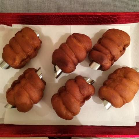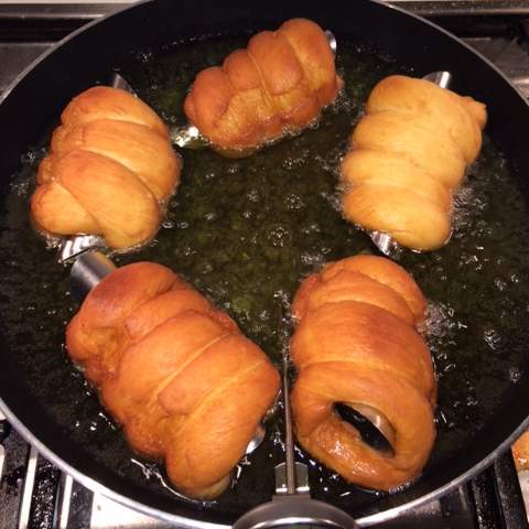 Prendere i cilindri e arrotolarli intorno ai cannelli (quelli utilizzati anche per fare i cannoli Siciliani) avendo cura di fargli fare almeno 3 giri cercando di fissare l'estremità all'impasto stesso in modo da evitare che si possano aprire (attenzione a non tirare l'impasto).