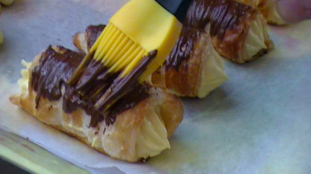 sciogliere il cioccolato fondente 3 min 50° vel 1 e spennellarlo sui cannoncini, con le codette al cacao farcite la crema che si intravede dal cannoncino.