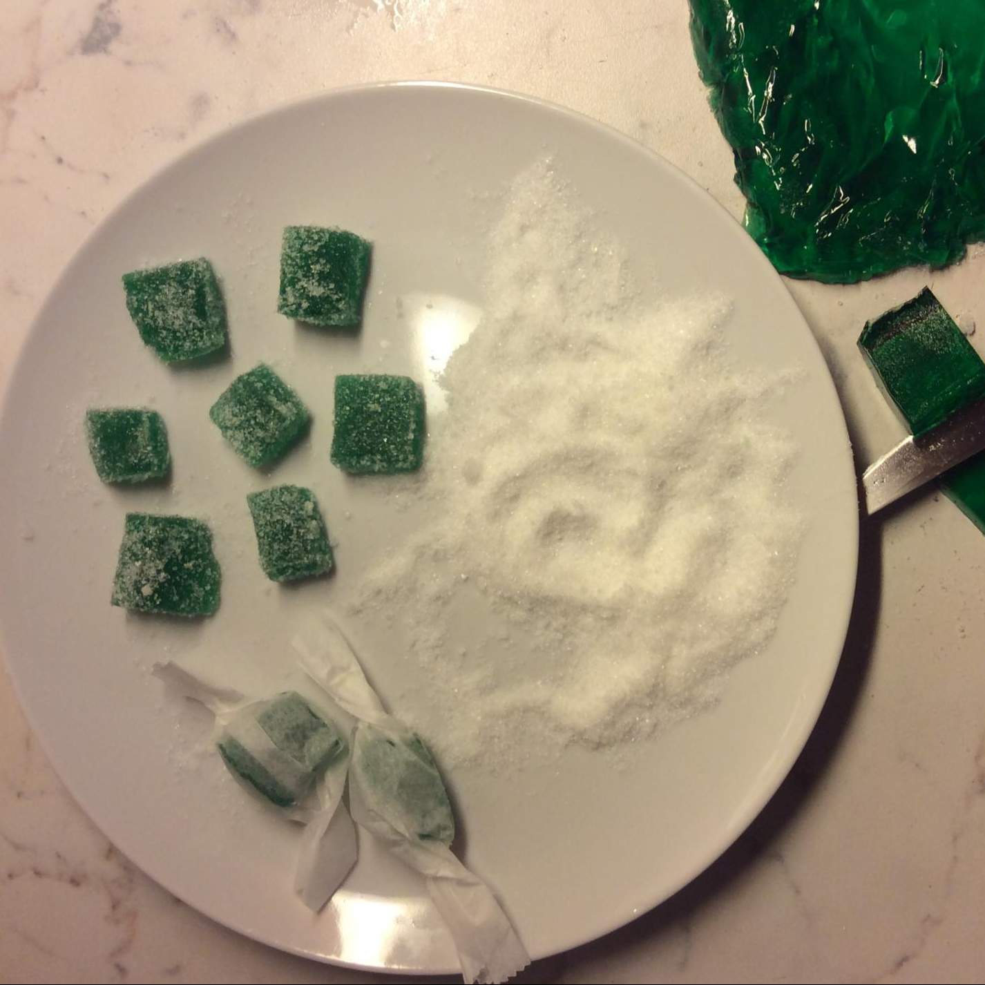 Quando la il succo si è solidificato togliere con molta delicatezza la gelatina dallo stampo. Adagiarla sul piano di lavoro e tagliare le caramelle della forma e della grandezza desiderata. Passarle sopra lo zucchero e conservare in frigo (dove mantengono la giusta consistenza).