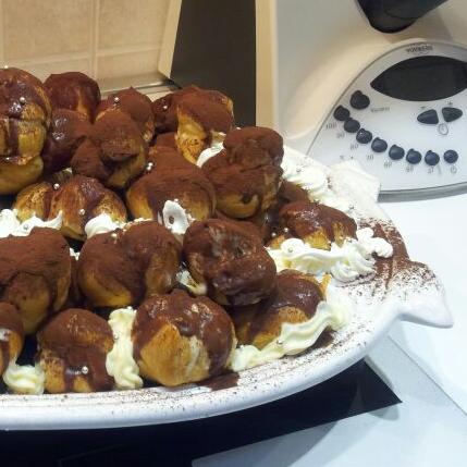 In una ciotola versare un po' di glassa al cacao, tagliare a metà i bignè e riempire di panna. Mettere uno sopra l'altro alternando con la glassa, glassare completamente e spolverare con cacao. Riporre in frigo per almeno 3 ore. Servire. È un dolce veloce e facile da fare con il Bimby io l'ho fatto spesso a volte anche con ripieno di chantilly o crema al cacao o nocciola.