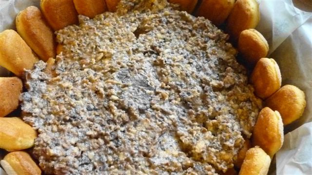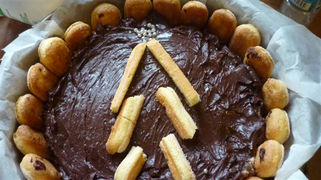"antiorario" vel4.Foderare il fondo di una tortiera dal fondo apribile ( io l'ho foderata prima con farta da forno) con i savoiardi e pennelati co il liquore rimasto, utilizzando x rivestire le pareti savoiardi tagliati a metà orrizzontalmente e posizionati in piedi.