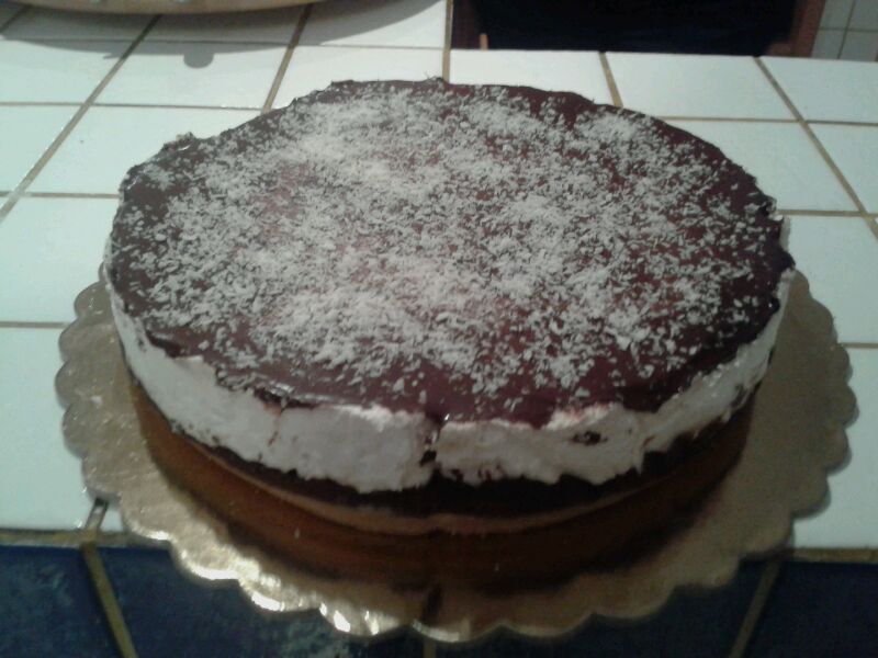 "coperchio chiuso" L'acqua ,lo zucchero,il cacao,e la colla di pesce (messa a bagno x 10 minuti),e sciogliere a 50° x 4 minuti vel.2.Farla raffreddare e infine versare sulla torta.Lasciare almeno 3 ore in frigo,e prima di servire,spolverare con la granella di cocco.