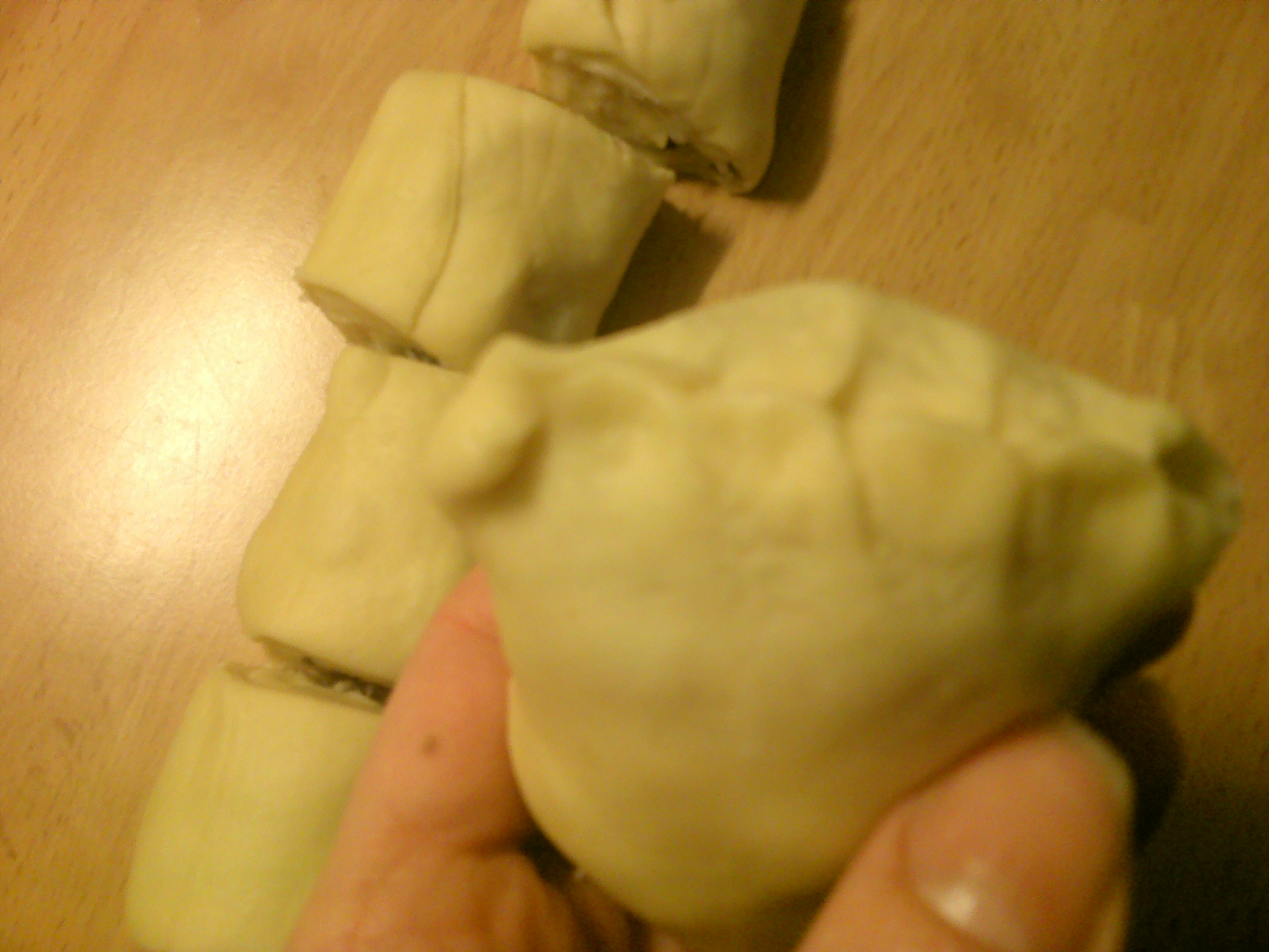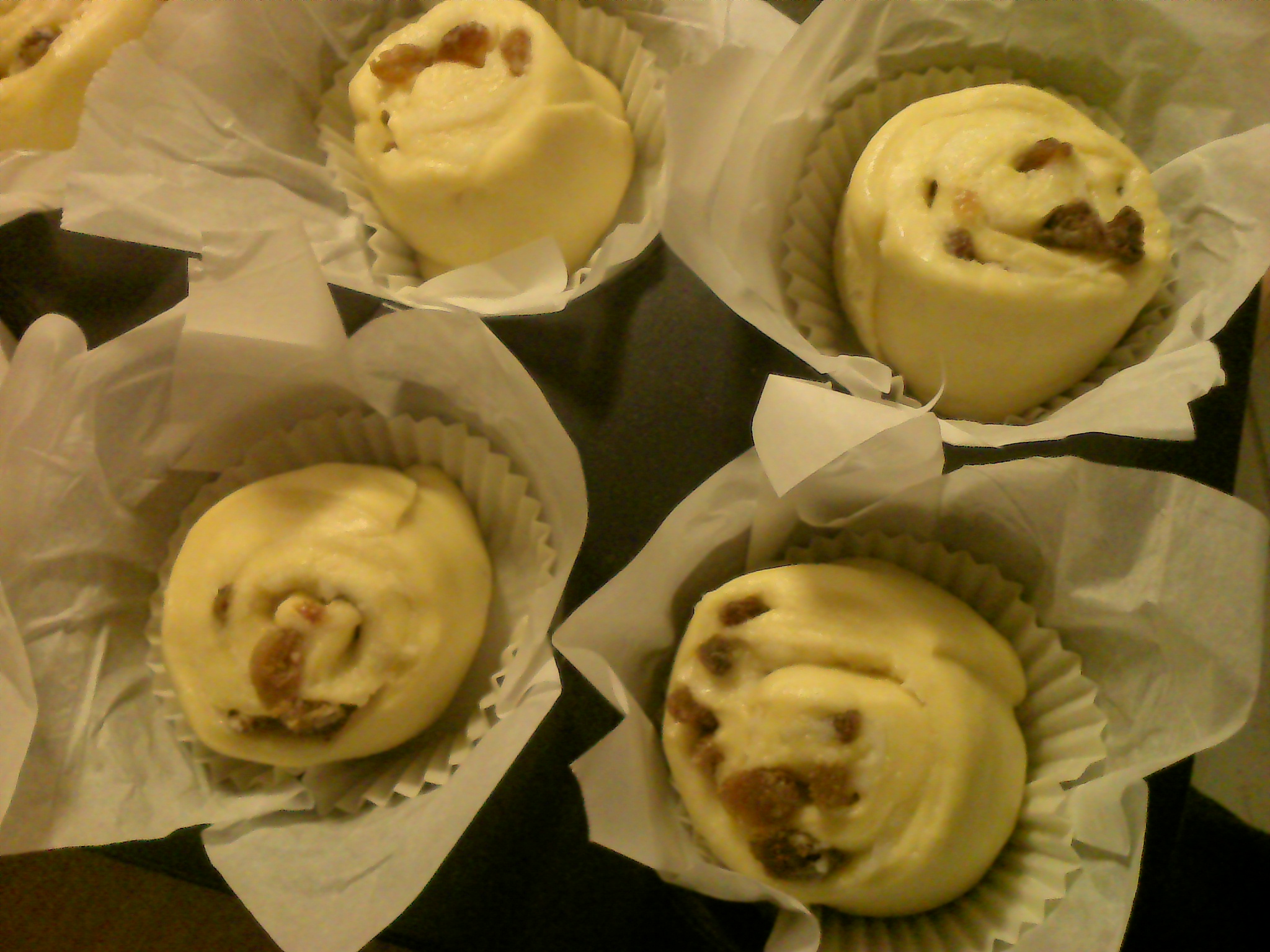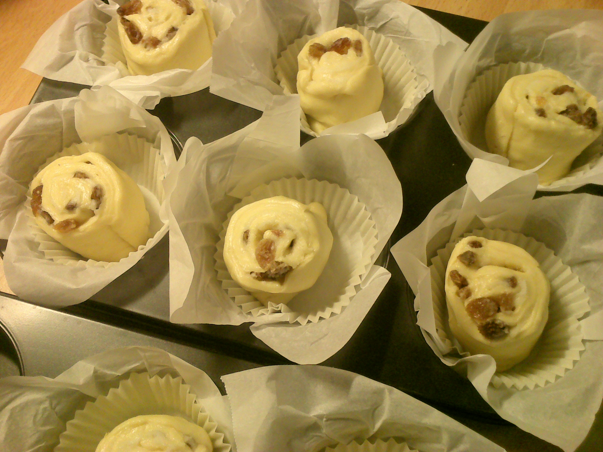 "velocità spiga" .Stendere l'impasto tra 2 fogli di carta da forno, formando un rettangolo molto sottile.PREPARA LA FARCITURA: metti a bagno l'uvetta nel grand-marnier, mettere nel boccale burro e zucchero lavorare 1 min. vel. 3 . Stendere il composto ottenuto sul rettangolo, cospargi con l'uvetta ben strzzata ed asciugata, forma un salame, taglia dei tronchetti alti 4 cm. e sigilla solo da un lato.Fodera degli stampi da muffin con carta da forno e metti anche il pirottino da muffin ed inserisci in ognuno il cilindro tagliato con il lato chiuso sotto. Mettere a lievitare 1 ora. Cuocere in forno preriscaldato a 180° per 25- 30 minuti circa. Sfornare e lasciare raffreddare bene, spolverizzare con zucchero a velo.
