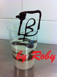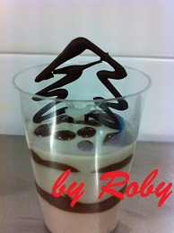 Decorare dei bicchierini monoporzione come segue: mettere sul fondo del bicchiere un cubetto di pandoro, ricoprire di crema al mascarpone sino a metà bicchiere, decorare con salsa al cioccolato e ripetere nuovamente, pandoro e crema, decorare con salsa al cacao a piacere. Mettere in frigo a raffreddare. Prima di servire, posizionare su ogni bicchiere un decoro di cioccolato fondente