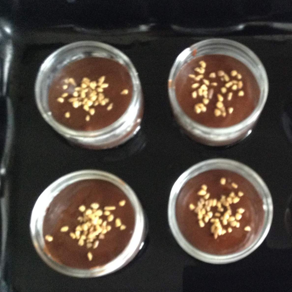 2.  Imburrare i stampini e versarci la  preparazione. Nel mezzo mettere il quadretto di cioccolato e ricoprire. In fine decorare  di noccioline a pezzi e infornare per 10 minuti in una teglia riempita con il bicchiere d'aqua.