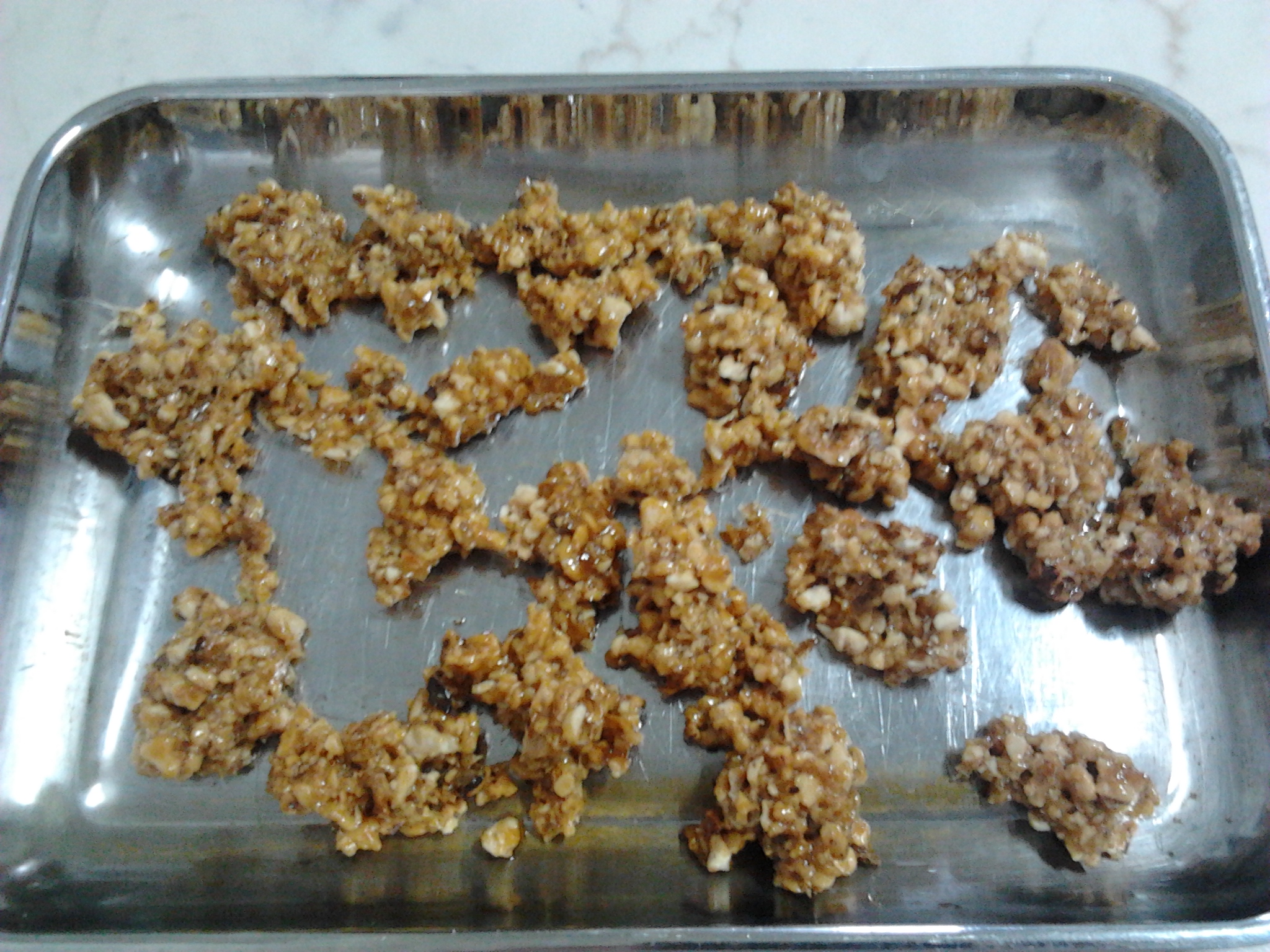 pulito le nocciole per 35 sec. vel.5. Aggiungerle al caramello e versare il composto in una pirofila appena oleata, senza ammassarlo (come foto). Si raffredda in pochi minuti, poi tritare per 2 o 3 sec.vel.5 , senza farlo polverizzare. Mettere da parte.Preparare la mou in un pentolino con acqua e zucchero e contemporaneamente riscaldare la pannain un altro pentolino. Quando il caramello prende colore unire la panna calda e cuocere per 1 minuto circa (si deve leggermente addensare). Far raffreddare.