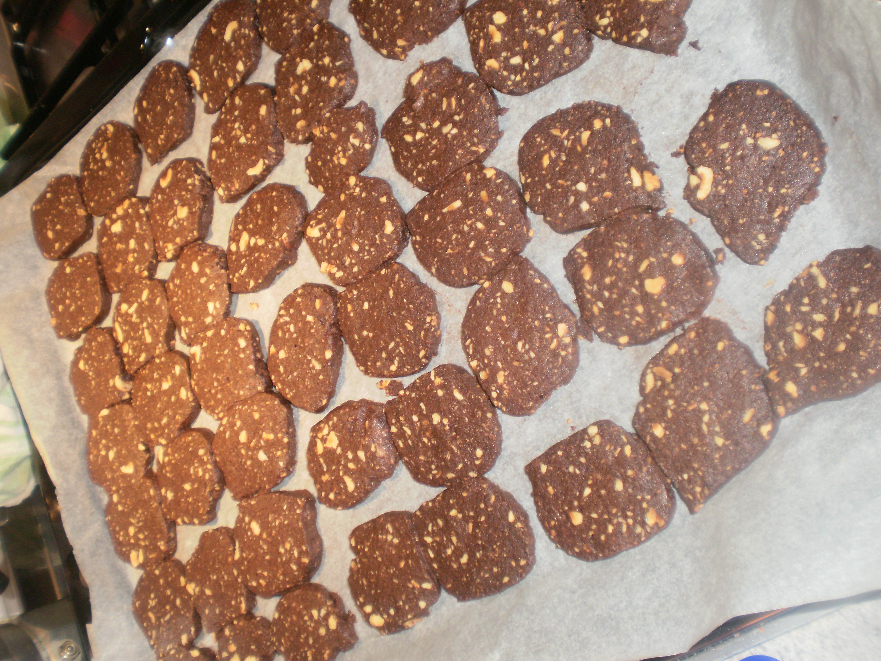 Formare un rotolo di circa 4 cm. di diametro, avvolgerlo nella pellicola e mettere in frigo per 12 ore. Tagliare delle fettine di mezzo cm. di spessore e disporle su teglie coperte di carta forno. Cuocere a 160° per 15' - 20'.