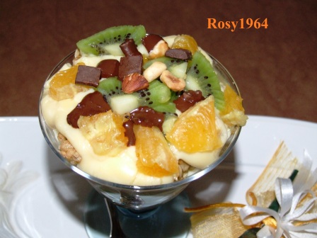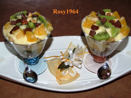 Versare in 4 coppe metà muesli e metà frutta. Coprire con metà crema, formare un nuovo strato di muesli e un secondo strato di crema. Terminare con la frutta rimasta.