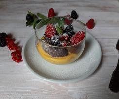 12. Una volta fatto poi ci mettere le more i lamponi e poi foglioline di menta e un po' di zucchero a velo che abbiamo lasciato da parte precedentemente