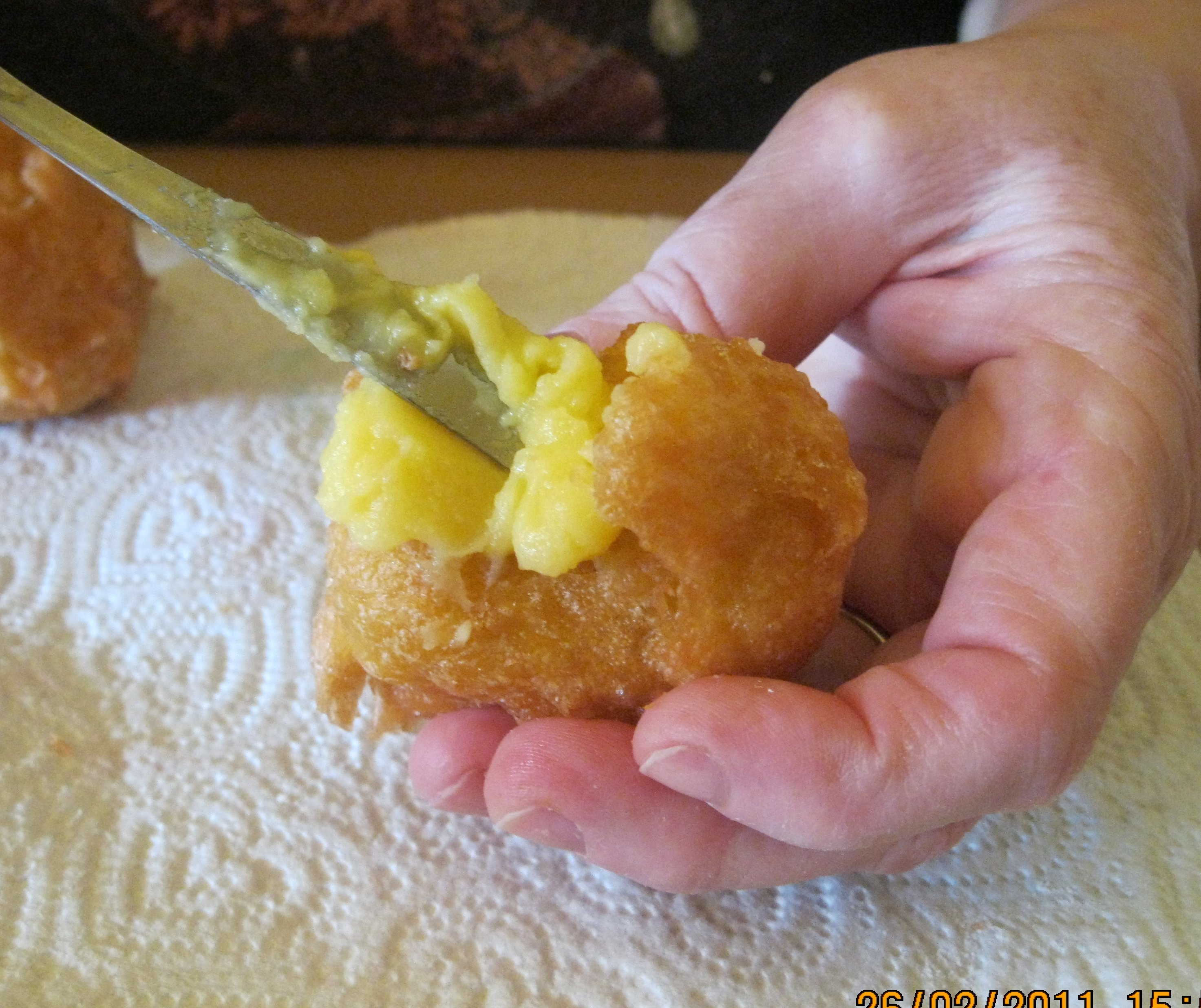 "coperchio chiuso" .Poi unire le uova una alla volta a vel 6. Fare riposare in una ciotola per 1 ora circa.In un tegame fare scaldare l'olio e aggiungere il composto a cucchiaiate fare cuocere fino a doratura.Fare raffreddare sopra una carta assorbente. Fare la crema pasticcera come libro base, togliere metà, e metterla in una ciotola . Nel