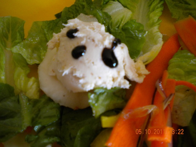 Appoggeremo una pallina di questo gelato su una insalata mista di verdura e frutta.