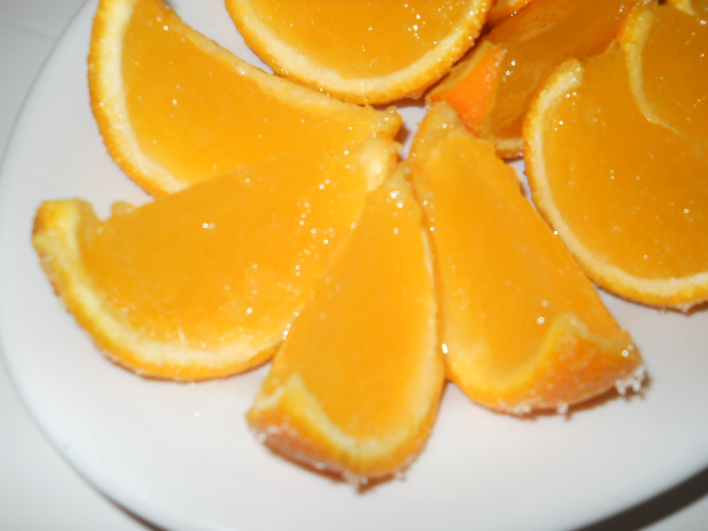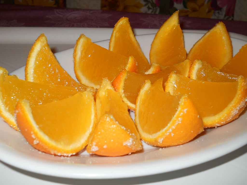 Prima di servire tagliare a spicchi e cristallizzare con zucchero semolato.