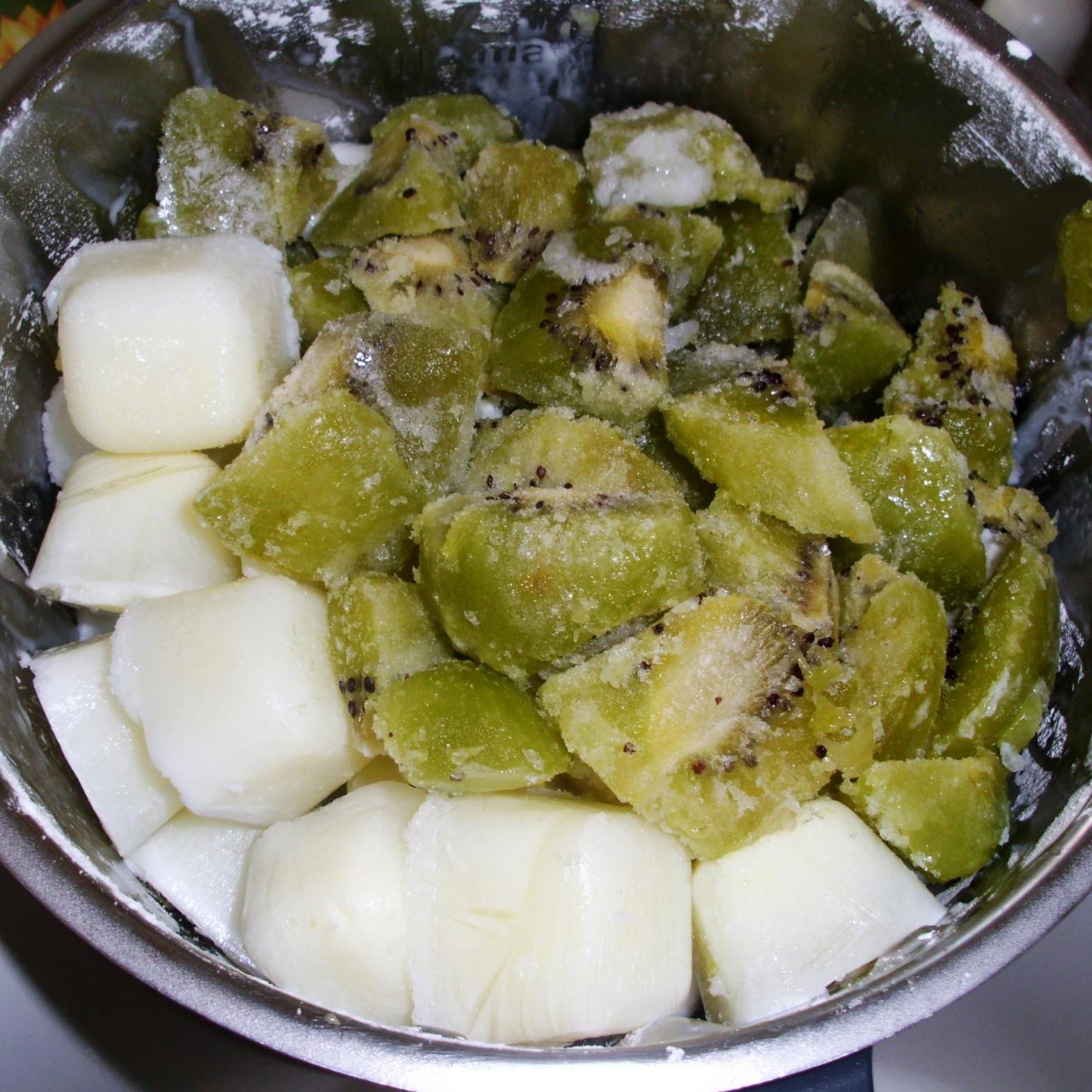 Unire il kiwi, il latte congelato e il succo di limone, frullare: 40 sec.vel.7 e 20 sec.vel. 4 spatolando. servire subito