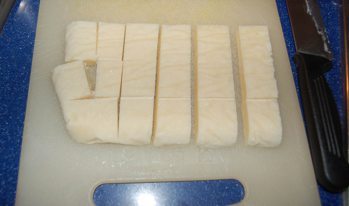 Una volta trascorso il tempo di congelamento, estrarre dal congelatore, prelevare la metà del gelato e tagliare a cubotti. Mantecare nel