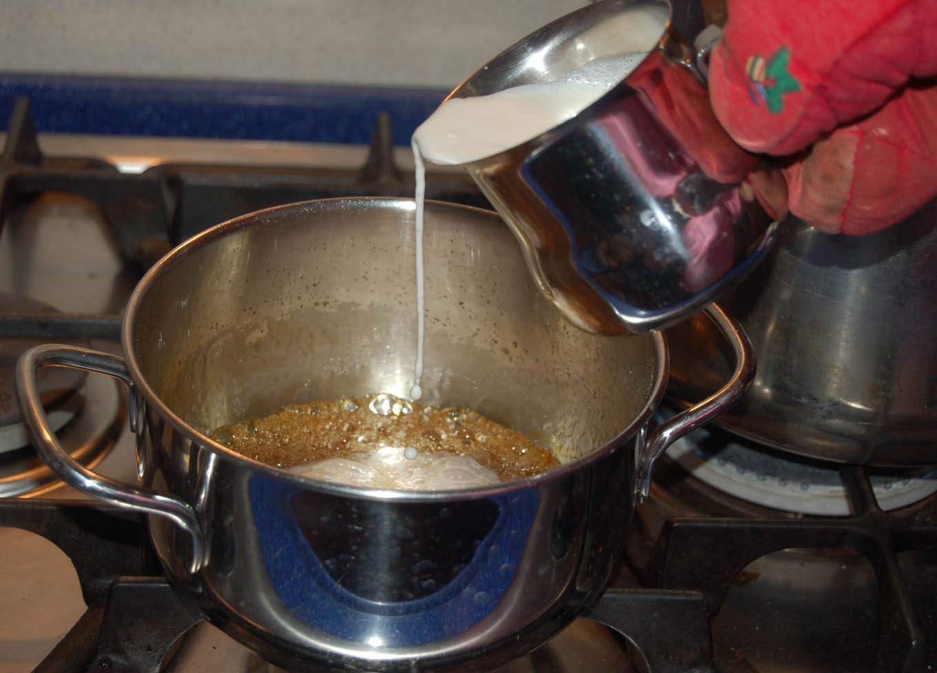Una volta formato il caramello, decuocerlo versandovi a poco a poco la panna calda (fare attenzione in questa fase, perchè il vapore che il caramello genera durante la decottura e piuttosto caldo!), abbassare la fiamma al minimo e far cuocere un altro minuto, mescolando per fare in modo che tutti gli eventuali grumi si sciolgano.