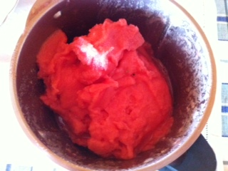 Scavare 1/4 d' anguria, tagliare a cubetti, togliere i semi e mettere a congelare per almeno 3 ore.