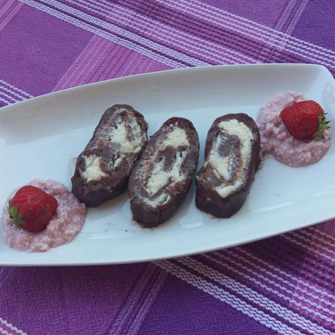14. Una volta trascorsi i 20 minuti, prelevare la carta dal rotolo, tagliare delle fettine dello spessore di circa 1cm, e servire accompagnate dalla crema alle fragoline e cocco. Se si preferisce la crema può essere servita anche in bicchierino. Nel caso in cui si prepari il rotolo in anticipo, consiglio di preparare la crema almeno un'oretta prima di servire. Conservare la crema massimo 24 ore in frigo.