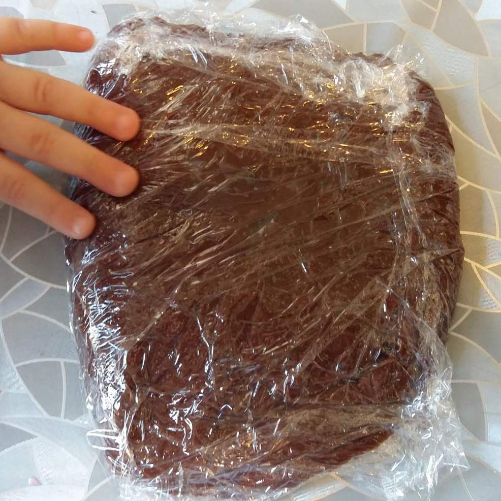 7. Stendere un foglio di pellicola trasparente lungo circa 30 cm, versarvi sopra il composto con l'aiuto della spatola, avvolgere la pellicola formando un panetto come in foto. Riporre in freezer per circa 15/20 minuti.