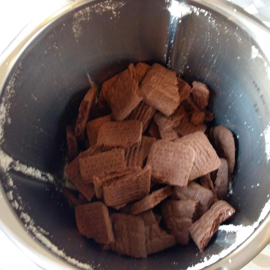 5. Nel coperchio chiuso"coperchio chiuso" pulito e asciutto inserire lo zucchero e la farina di cocco, polverizzare 15 secondi vel 10, riunire sul fondo con la spatola e ripetere altri 10 secondi vel 10. Aggiungere i biscotti spezzettati e tritare 15 secondi vel 9. Versare il latte freddo e amalgamare 20 secondi vel 5. Il composto risulterà cremoso e leggermente appiccicoso