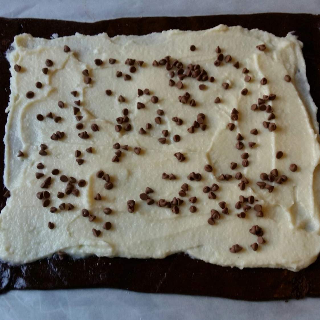 12. A questo punto versare la crema al mascarpone  sulla base stesa e livellare con l'aiuto della spatola lasciando liberi i bordi tutto intorno per circa 1 cm, distribuire in ultimo le gocce di cioccolato.