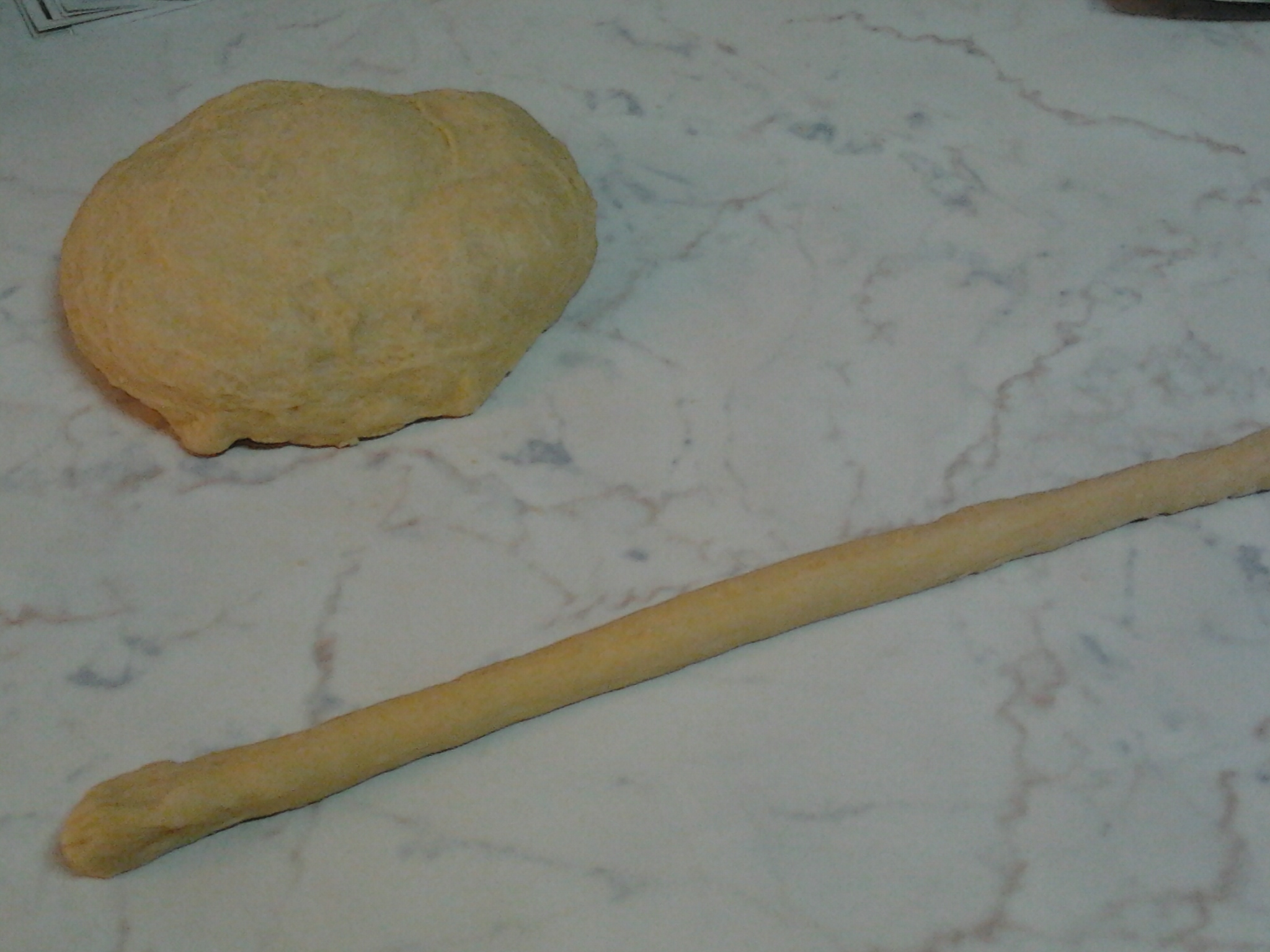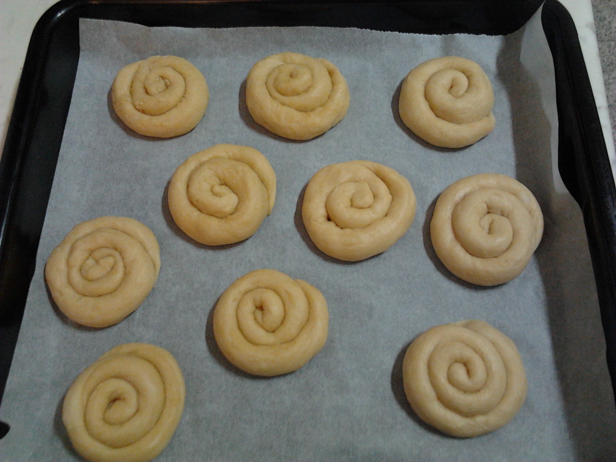 Appena l'impasto è lievitato, formare dei bastoncini grossi come un dito e lunghi 30 cm, arrotolarli a spirale e sistemarli sulla teglia su carta forno.
