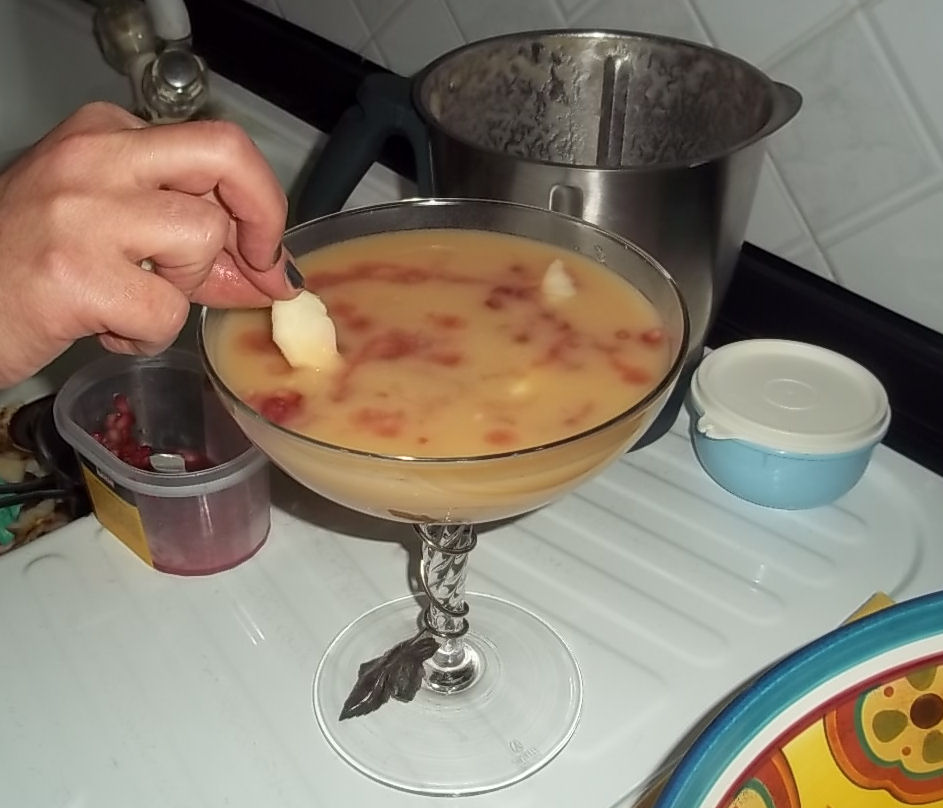 5. Guarnire con la panna montata e decorare il tutto con altri chicchi di melagrana e, a piacere, con alcune foglie di mela annurca ben lavate.