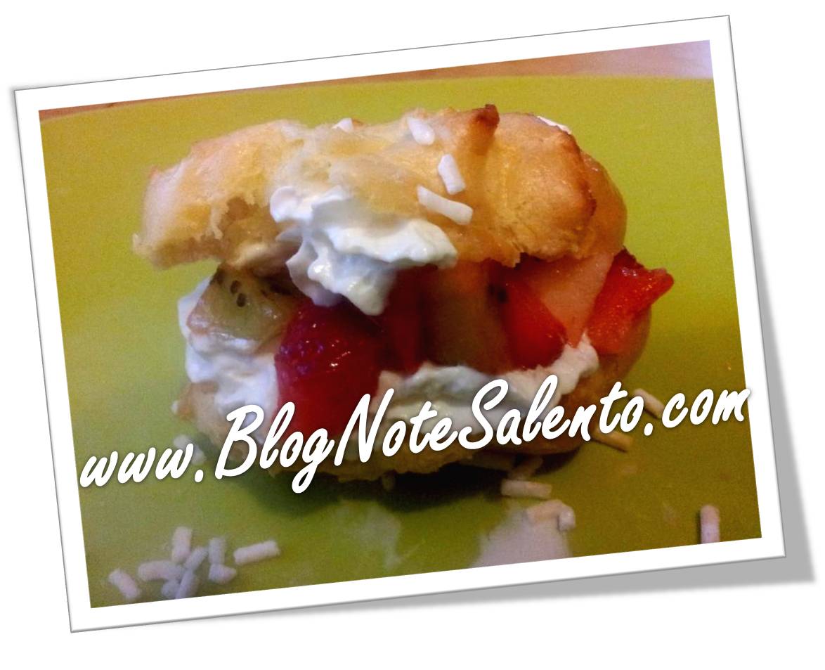 tagliare il maxi bignè a metà(nel senso verticale) inserire la panna e un cucchiaio di macedoni.