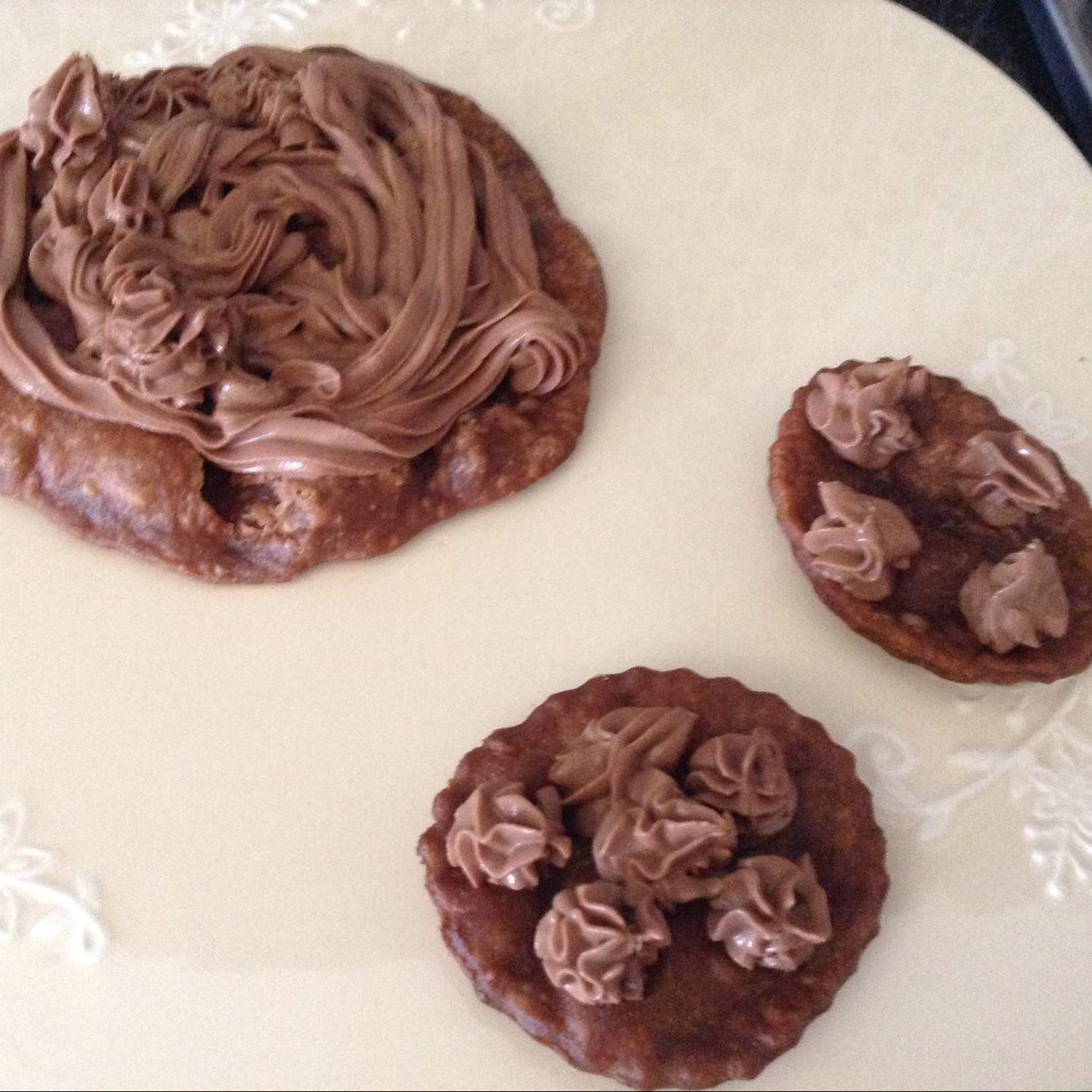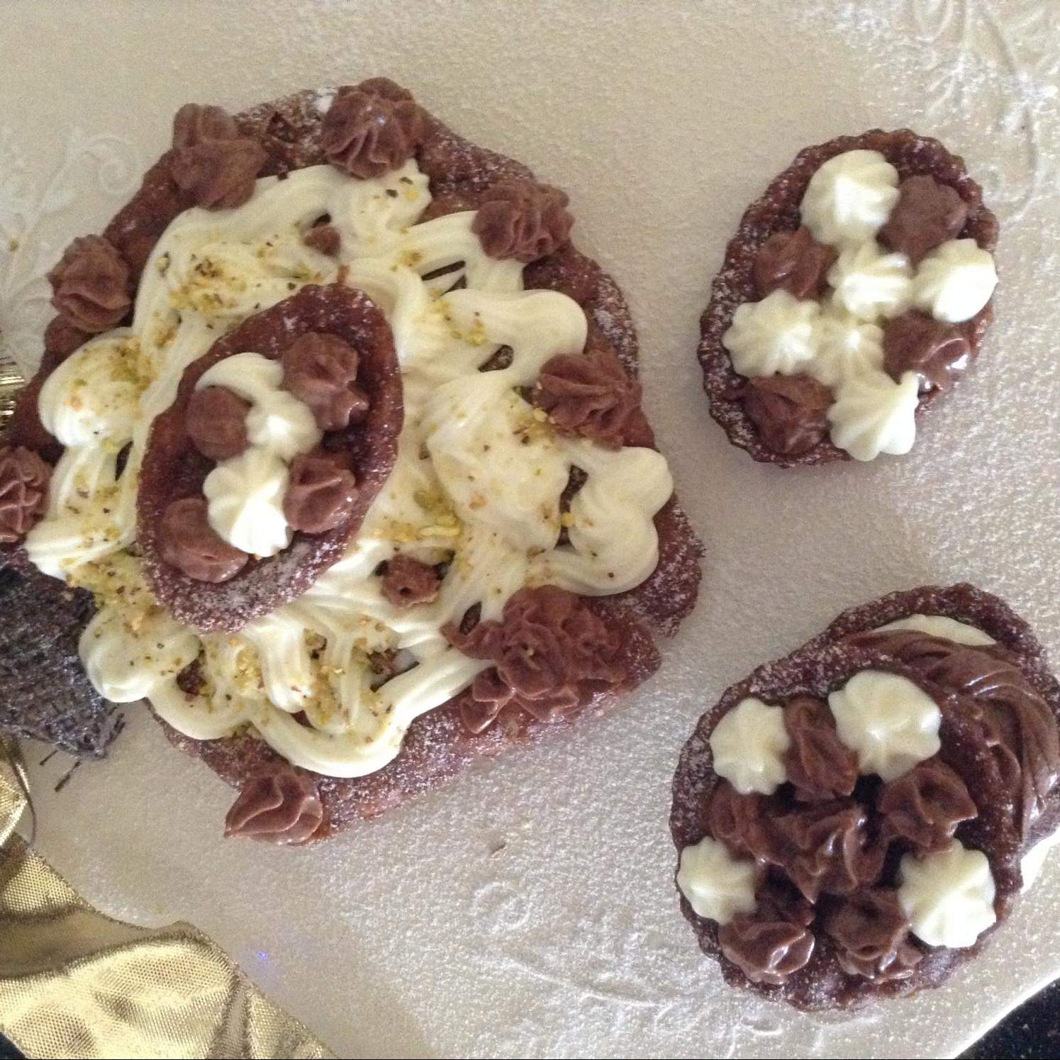 Prendere un piatto da portata, inserire la crema bianca nella sacca da pasticcere (io sparabiscotti) e adagiare una cialda coprirla con la crema (farlo per le cialde che servono, così si usa tutta la bianca e poi si può procedere con quella fondente) e alternare gli strati
