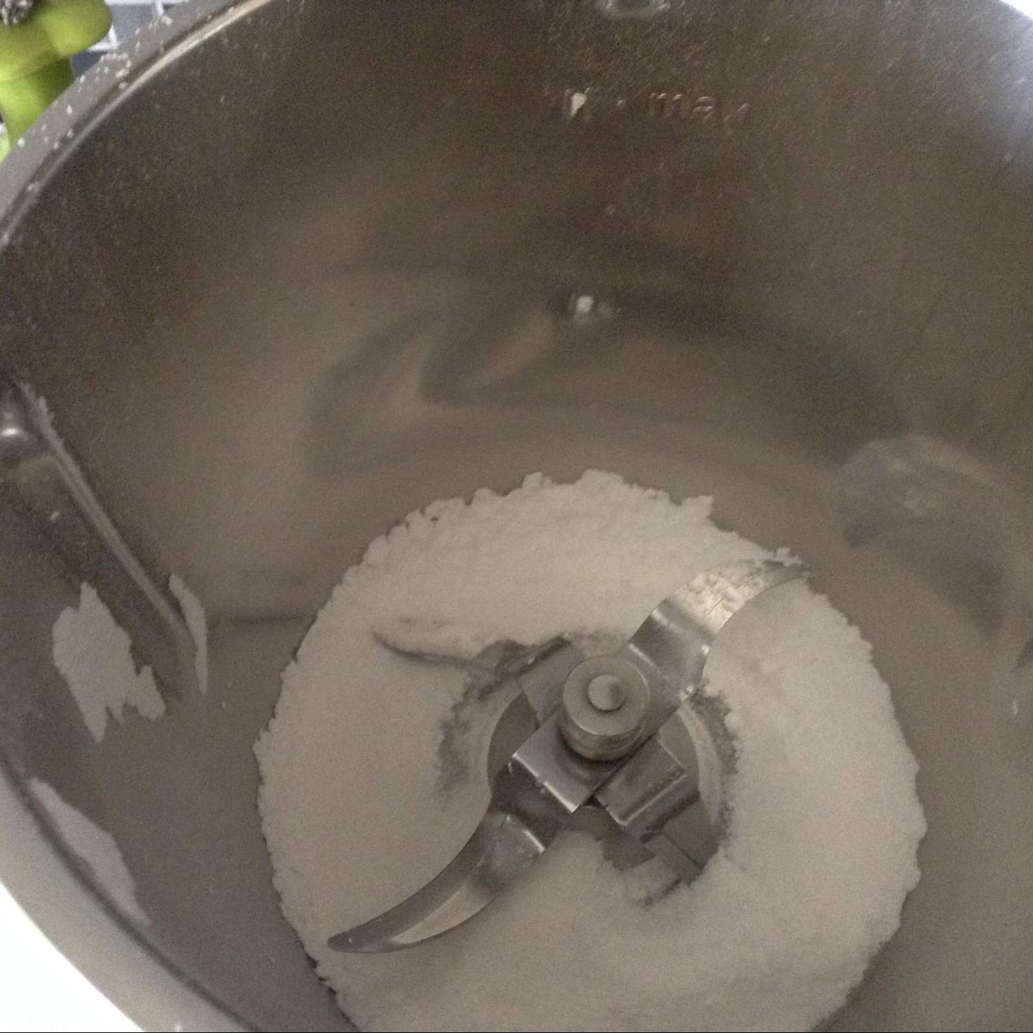 Inserire nel boccale i 115 grammi di zucchero semolato (totale ricetta) e polverizzare: 10 sec/vel 10