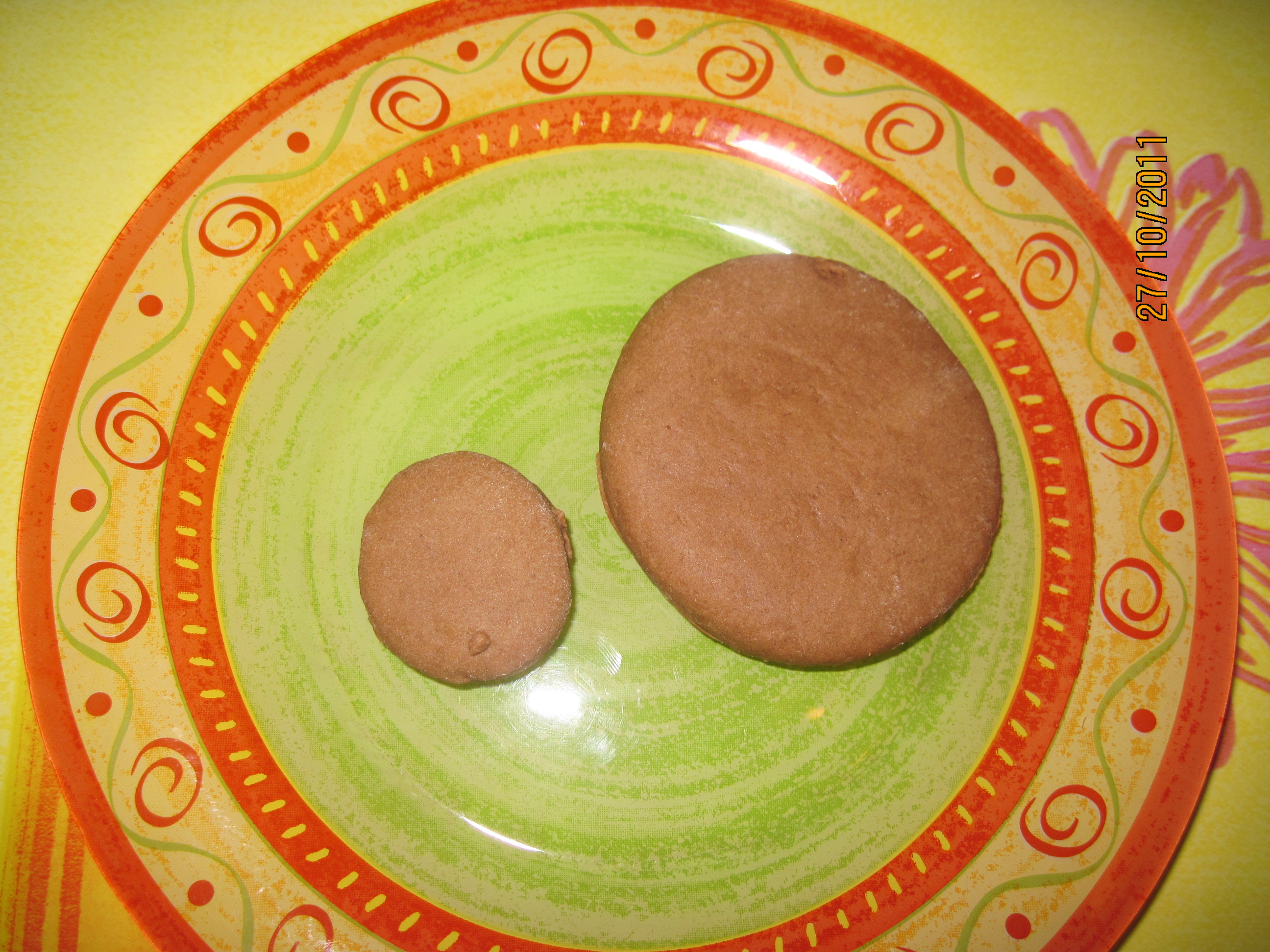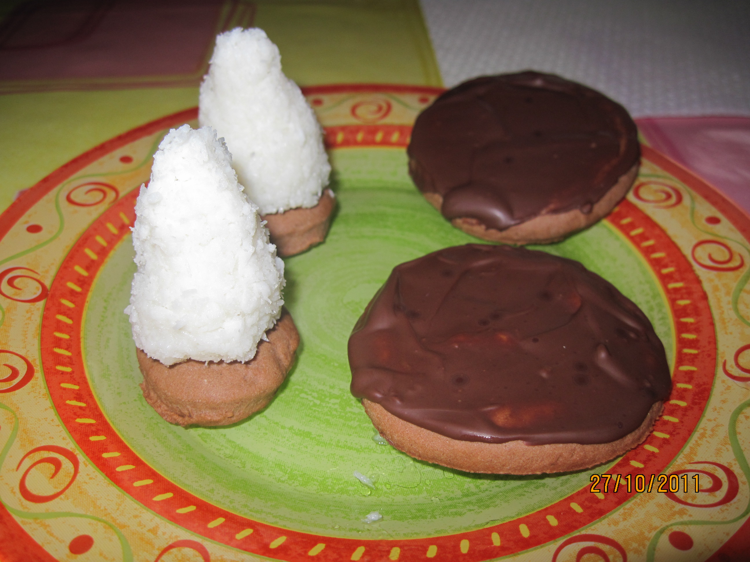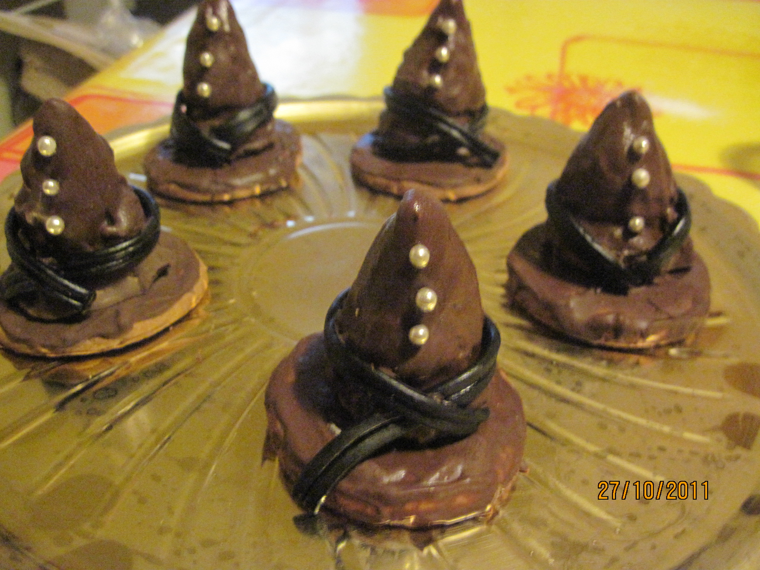 Trascorso il tempo di posa stendere l'impasto alto circa 1/2 cm e preparare in ugual numero dischi di 3,5 cm di diametro e 7 cm di diametro circa (io non avendo uno stampo tagliabiscotti ho usato una tazzina da caffè per i primi e un bicchiere per i secondi) e infornare in una teglia foderata da carta da forno per 15 min circa a 180°. Una volta cotti...lasciare raffreddare i dischi. Nel frattempo preparare il ripieno, impastando a mano il cocco, lo zucchero e il latte. Il composto che ne deve risultare deve essere alquanto compatto per cui regolarsi se il latte è in eccesso aggiungere altra farina di cocco. Per avere una maggiore compattezza si potrebbe, se piace, aggiungere un cucchiaio di ricotta. Con le mani predere un pezzetto di ripieno strizzarlo (in modo da liberare liquido in eccesso)e formare un piccolo cono che andrà adagiato sul disco più piccolo. Ripetere l'operazione per tutti i dischi piccoli. Sciogliere intanto a bagnomaria il cioccolato fondente e al latte. Ricoprire col cioccolato fuso i coni di cocco adagiati sui dischi piccoli: colare il cioccolato dall'alto e aiutarsi con un coltellino a stendere il cioccolato sulla superficie; poi disporre le tre palline argentate come da figura e la striscia di liquirizia ottenuta dalla rotella. lasciare asciugare.Questo costituirà la parte conica del cappello. Ricoprire in un secondo momento i dischi di diametro maggiore col cioccolato fuso e adagiarvi sopra nella parte centrale la parte conica del cappello. Far asciugare tutto e riporre in frigo.
