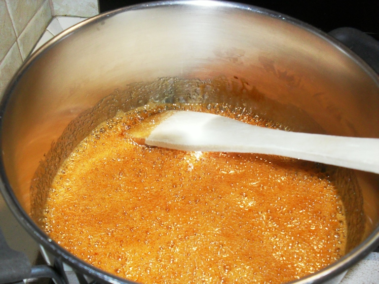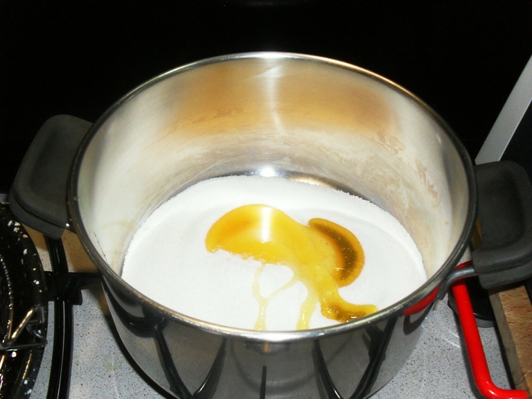 IN UNA PENTOLA CAPIENTE METTERE LO ZUCCHERO E IL MIELE FARE IL CARAMELLO ,