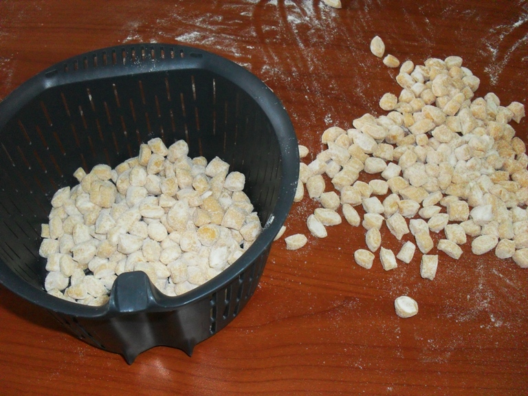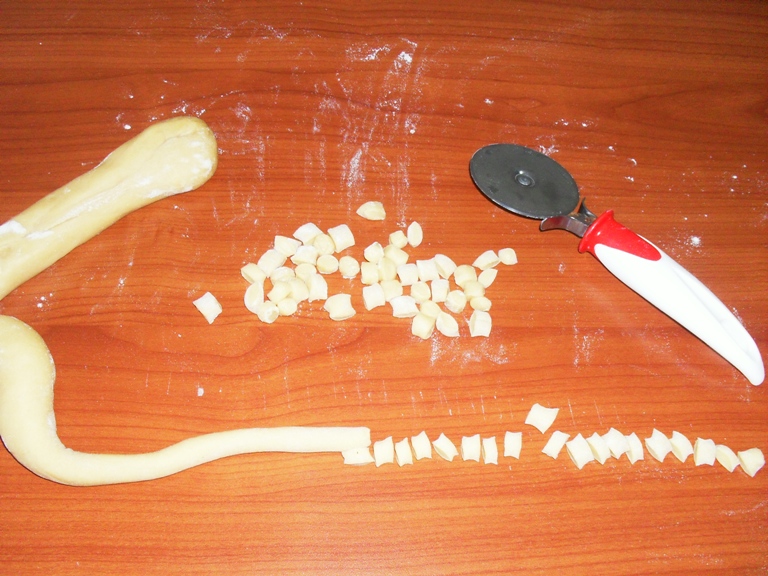DOPO FARE UNA CORDA SOTTILE E TAGLIARE A PICCOLI PEZZETTI, INFARINARE I PICCOLI PALLINI AFFINCHE’ NON SI ATTACCHINO .