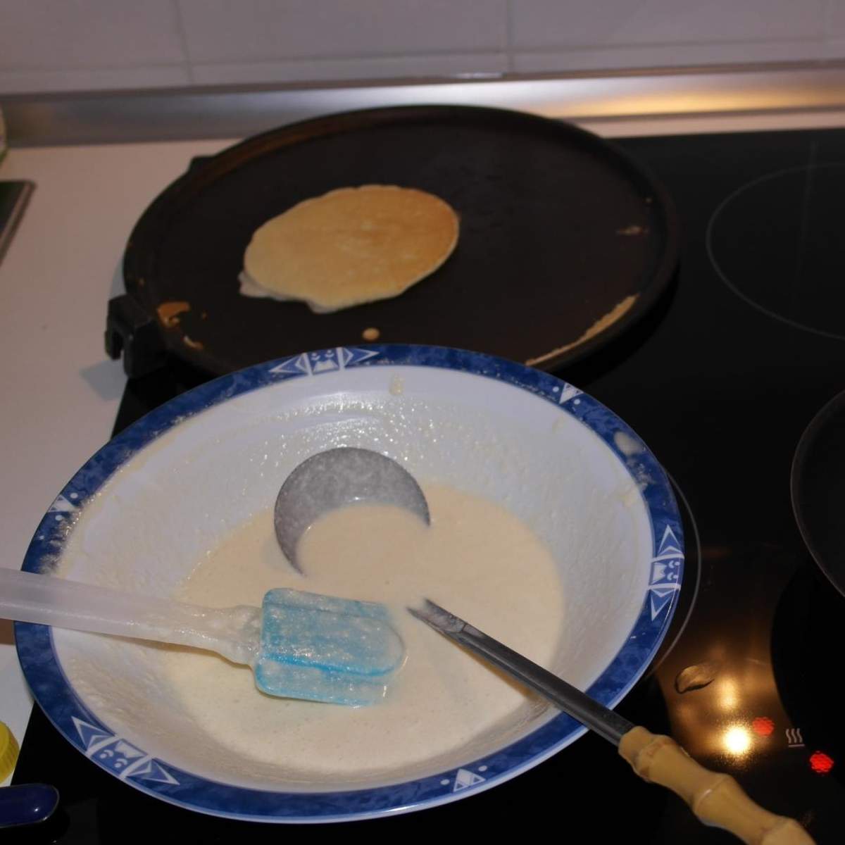 Cuocere i pancake versando un mestolo d'impasto su di una padella antiaderente ben calda e girare quando appaiono le prime bolle sulla superficie.