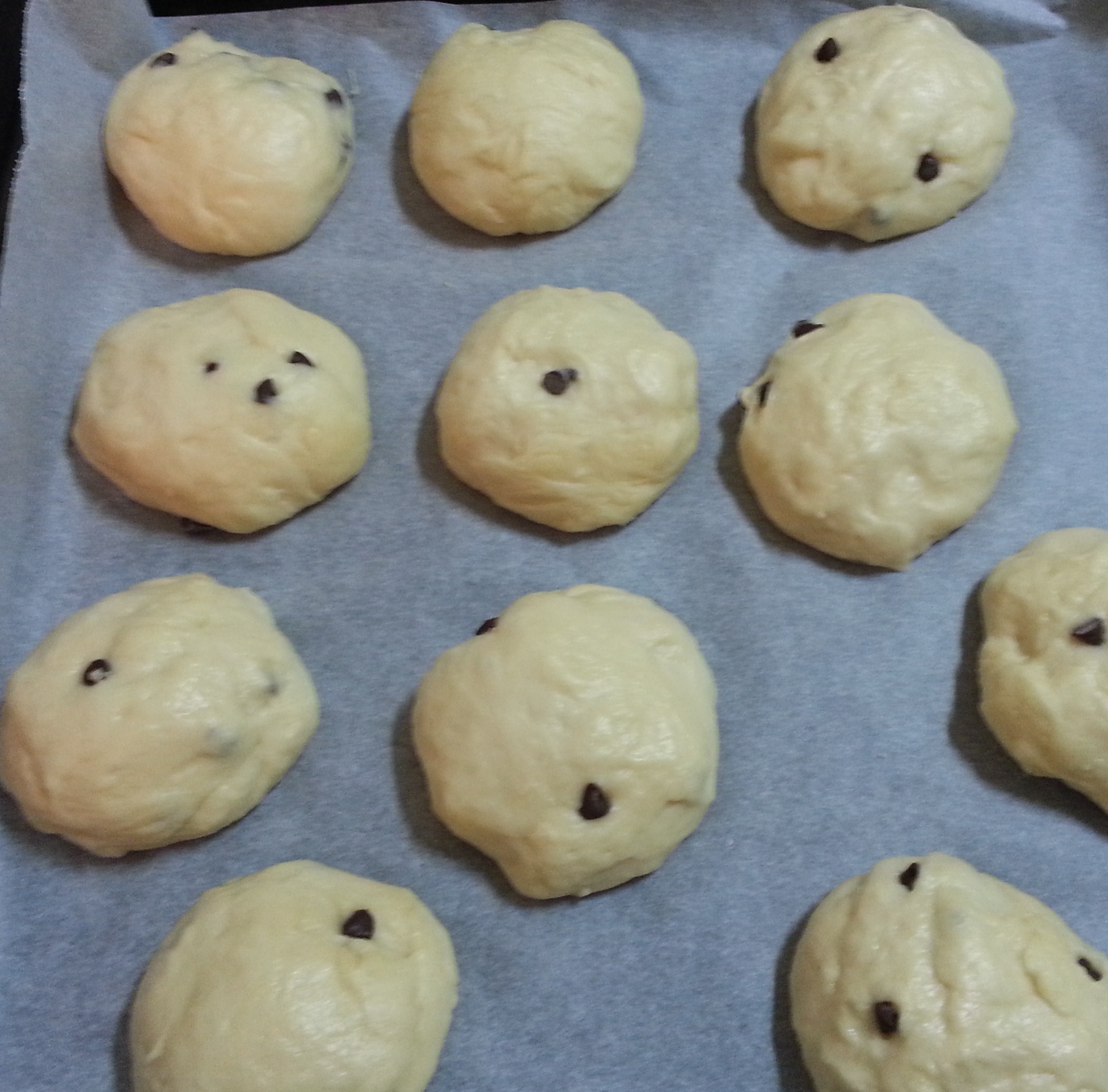 . Far lievitare in una coppa per 2 ore circa.Formare delle palline disponendole su carta forno incorporando le gocce di cioccolato.Far lievitare 1 ora circa e infine infornare a 180° per 20 minuti.