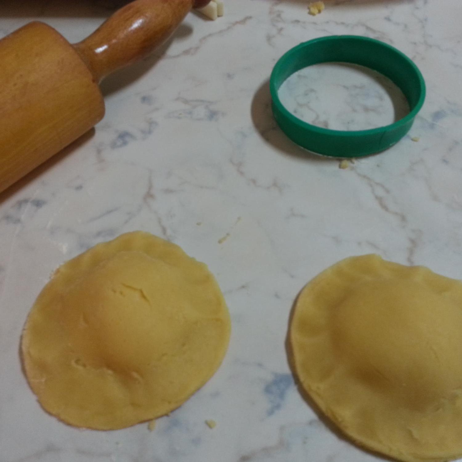 Stendere l'impasto col matterello dello spessore di circa 3 o 4 mm e tagliare dei dischi (io ho usato una formina da 8 cm di diametro). Riempirli con la ricotta dolce e con qualche goccia di cioccolato. Richiudere i bordi e infornare a 200 ° per 15 minuti circa.