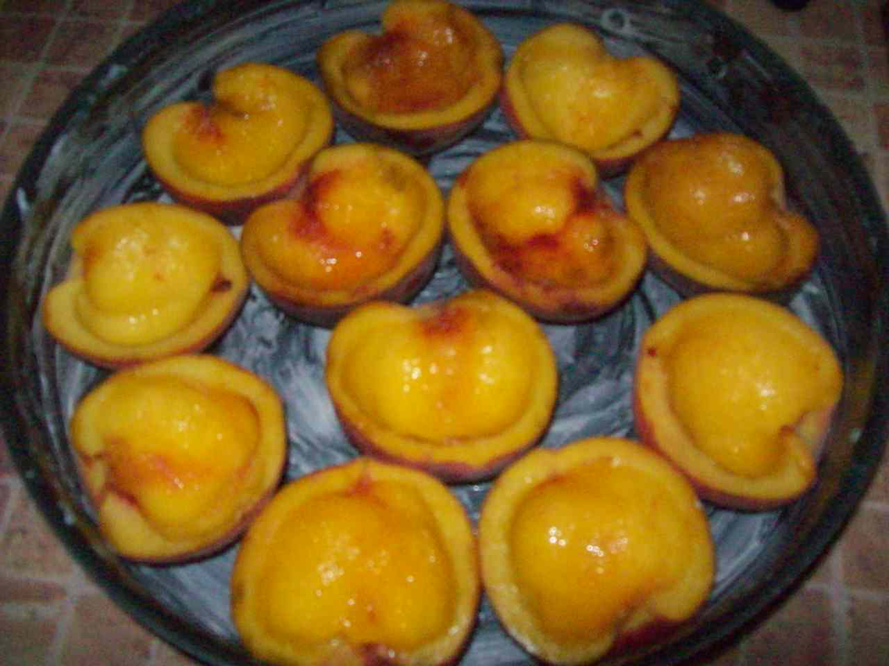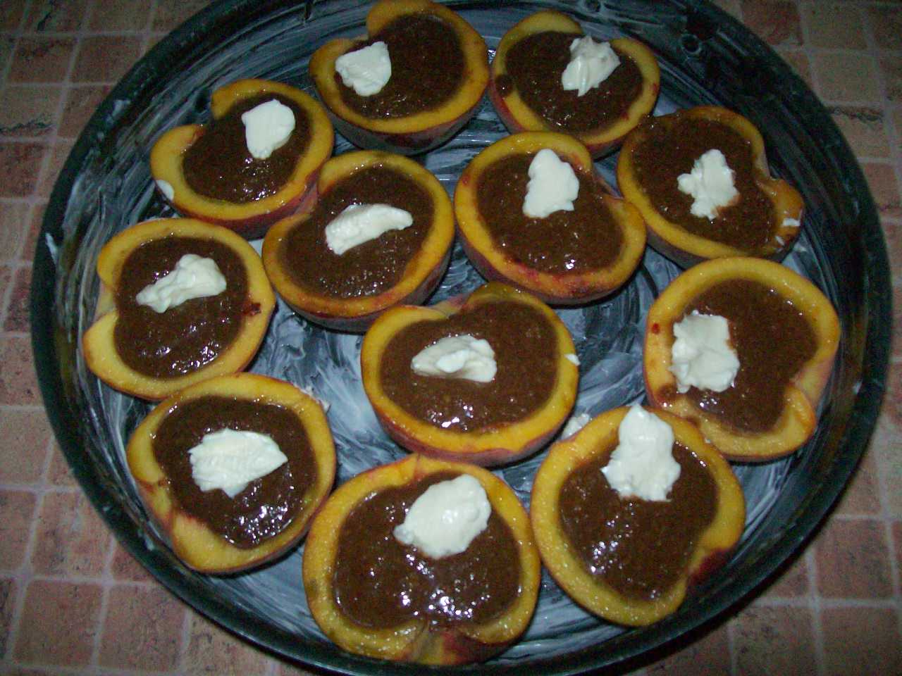 "coperchio chiuso" mettere i tuorli e lo zucchero: 15sec / vel 5. Aggiungere gli amaretti, il cacao, il rhum, il burro e la polpa: 10sec / vel 3. Imburrare generosamente la teglia, sistemarvi le pesche, l'una accanto all'altra. Il ripieno dividere in 2 parti. In una aggiungere il cioccolato, nell'altra, la cannella. Farcire le pesche, mettere su ognuna una noce di burro. Cuocere nel forno caldo: 30 - 40 min / 180°.
