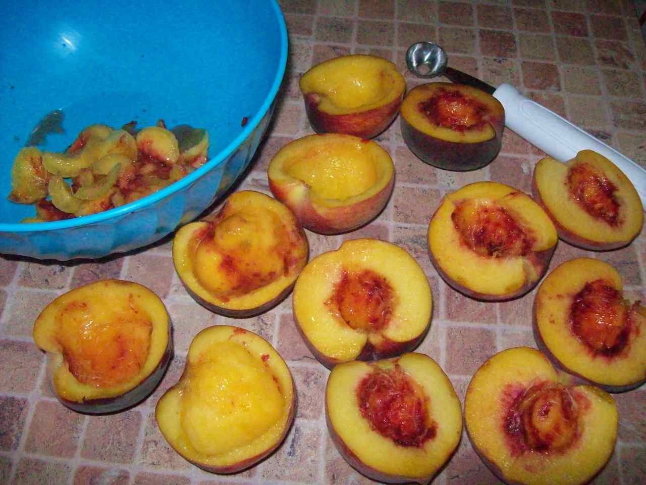 Tritare gli amaretti: 5sec / vel 5, mettere da parte. Tritare il cioccolato: 8sec / vel 8, mettere da parte. Lavare ene le pesche, asciugarle, tagliarle a metà. Togliere l'osso, i resti dell'osso. Svuotare un pò le pesche, la polpa mettere nel