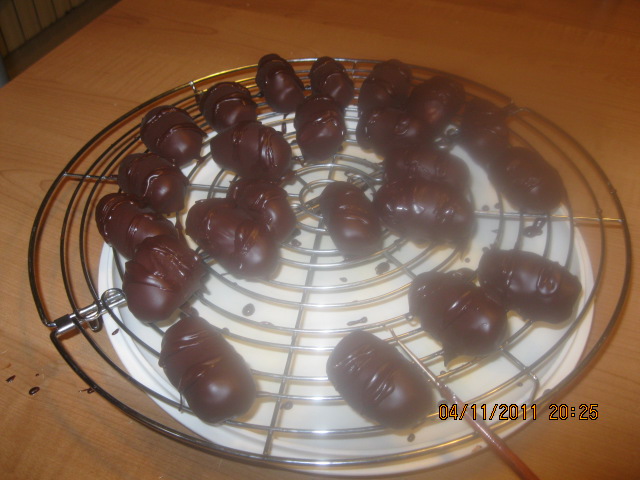 "coperchio chiuso" il cioccolato tritare per 10 sec vel 7 poi il burro e fondere per 5m 50° vel 3.Riprendere le praline e intigerle nel cioccolato fuso , mettere sopra una gratella e fare raffreddare. Poi passare con un pennellino e fare due righe traversali, mettere ogni pralina nel pirottino di carta ,conservare in frigorifero.