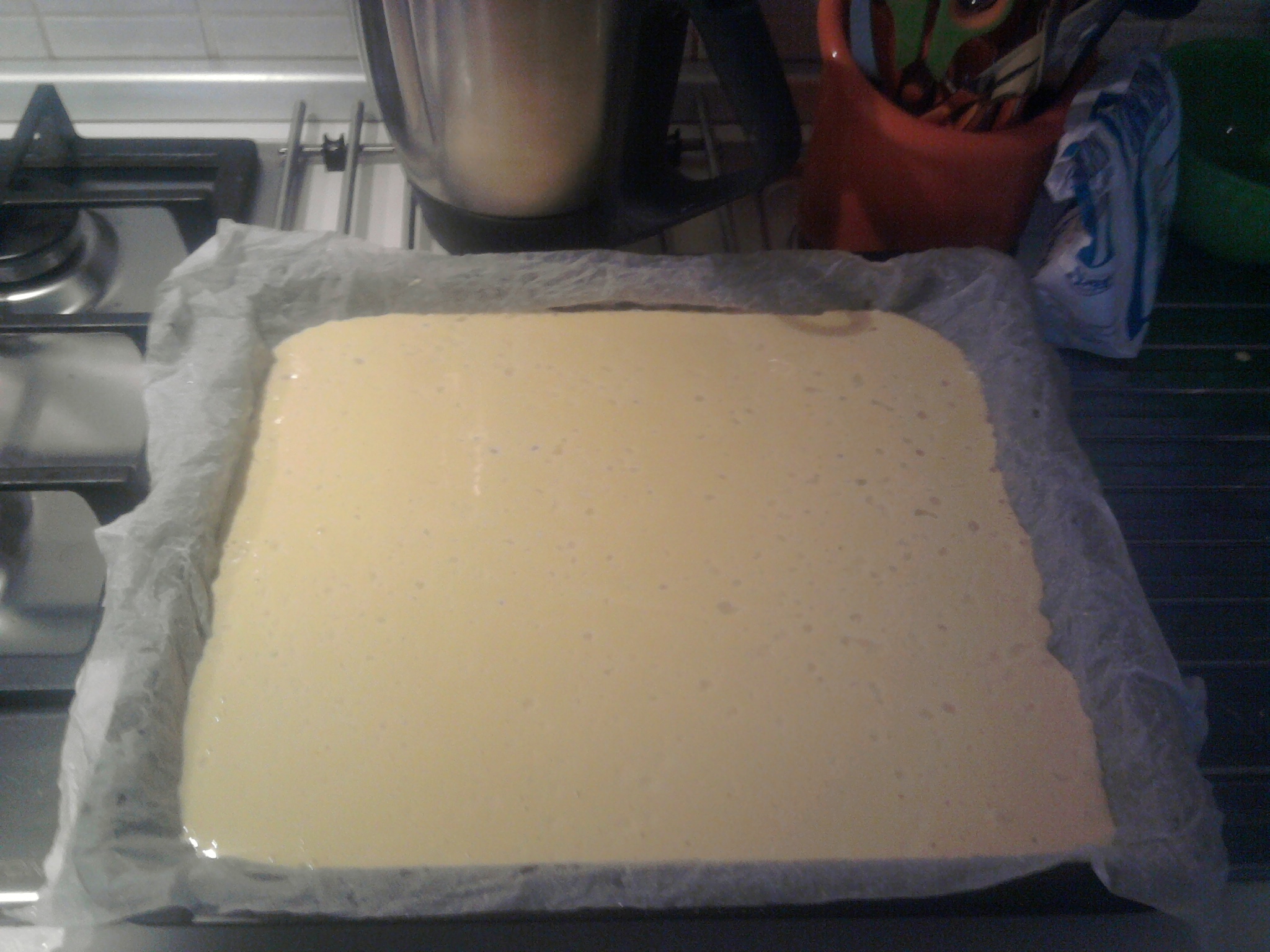 Trasferire il composto in una teglia bassa e larga, ricoperta di carta da forno, livellare e bagnare la superficie spruzzando dell'acqua. Cuocere 20 min. 180°